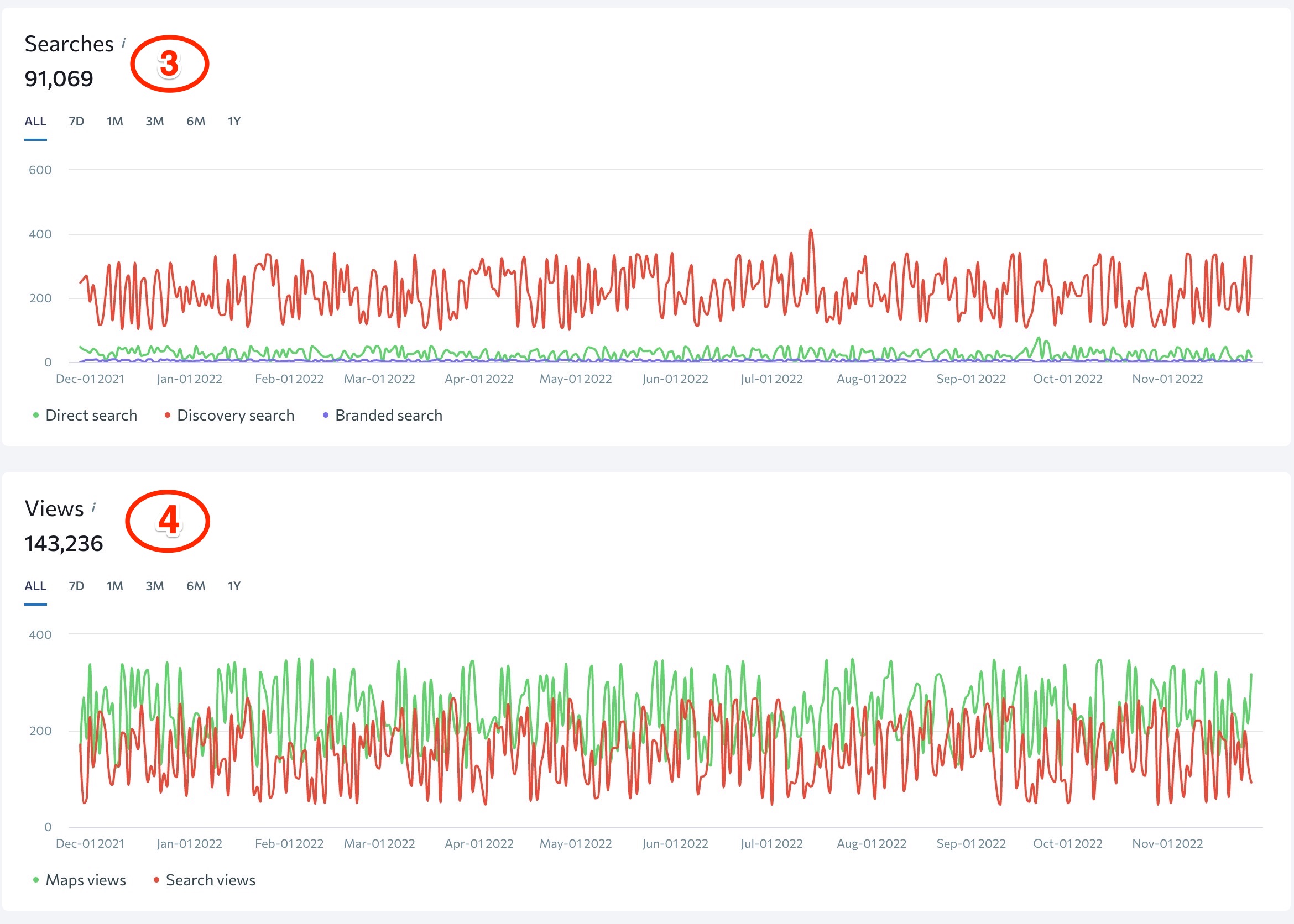 4. Ansichten. Diese Grafik zeigt, wie oft Nutzer das Profil dieses Unternehmens auf Google Maps im Vergleich zur Google Suche innerhalb eines bestimmten Zeitraums sehen.
