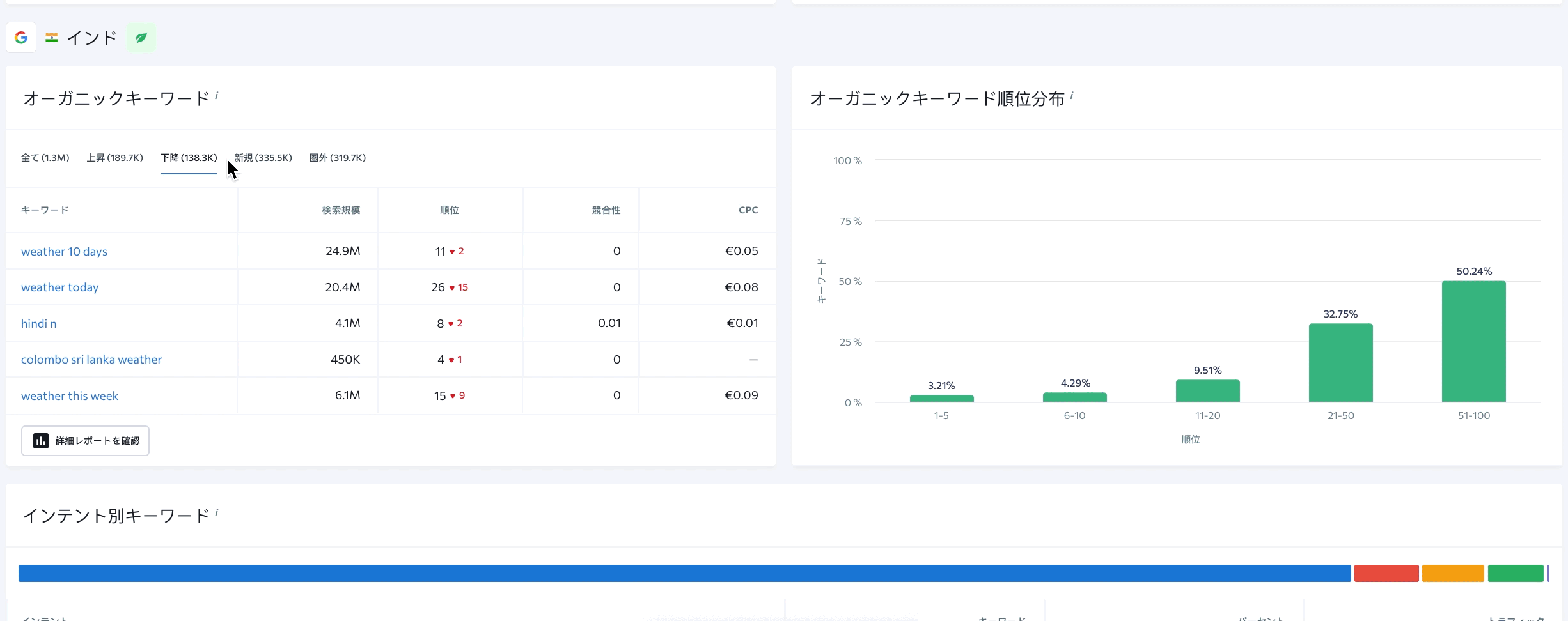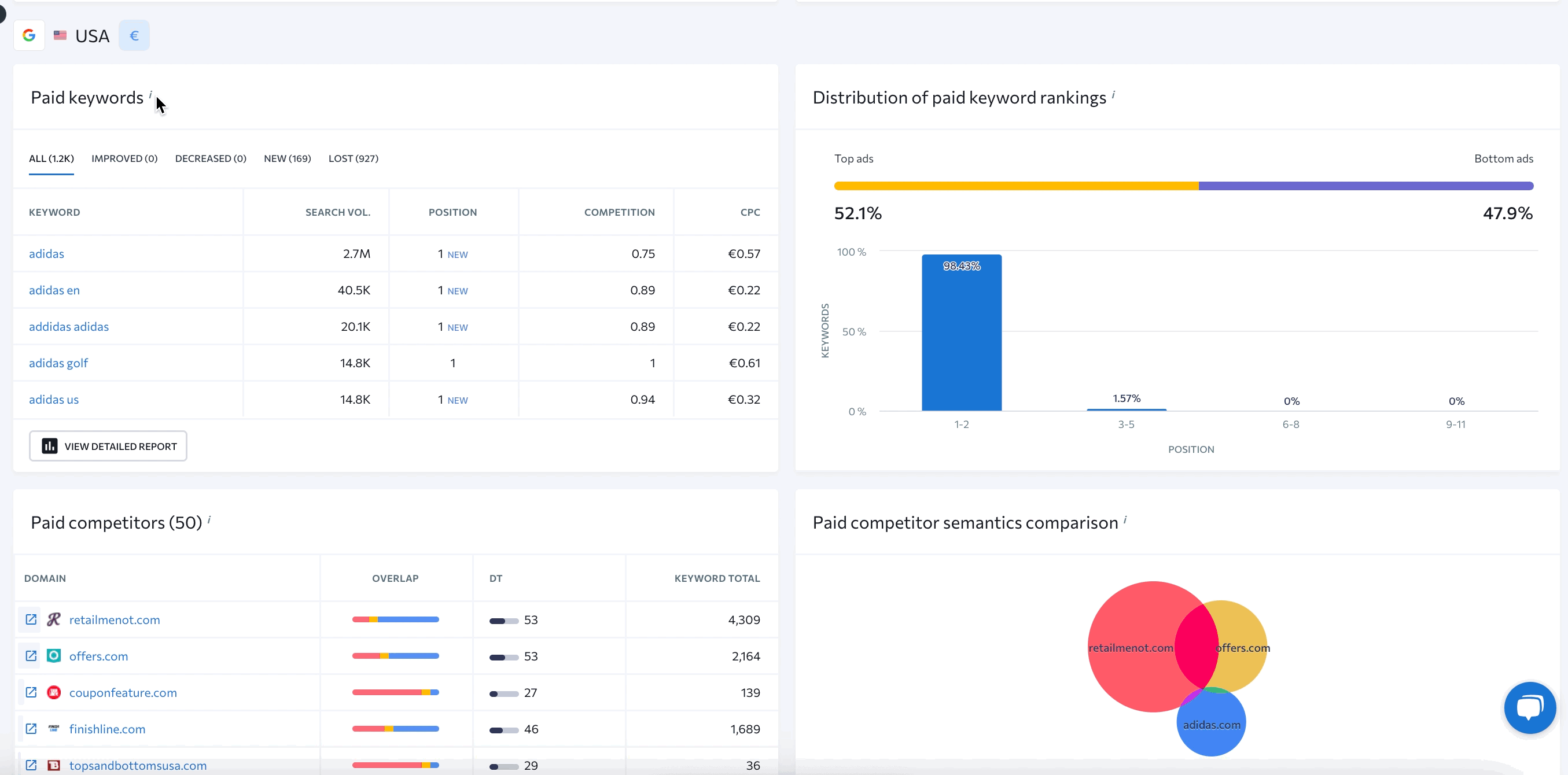Unterhalb der Übersicht der organischen Parameter findest du Informationen zu bezahlten Keywords, Mitbewerbern, deren Vergleich und Verteilung sowie weitere Details.