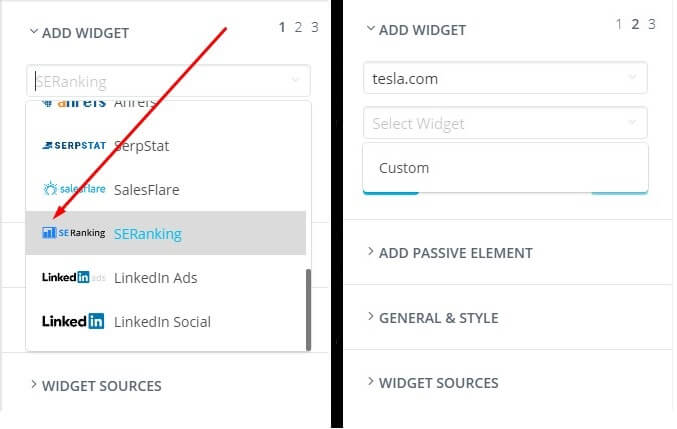 2. Dann solltest du auf die Quellenseite in der Reportz App gehen und den SE Ranking API Schlüssel hinzufügen. Danach wählst du die Website aus, die du verfolgen willst, und das Widget, das du hinzufügen möchtest (im Moment kannst du "benutzerdefiniert" auswählen).