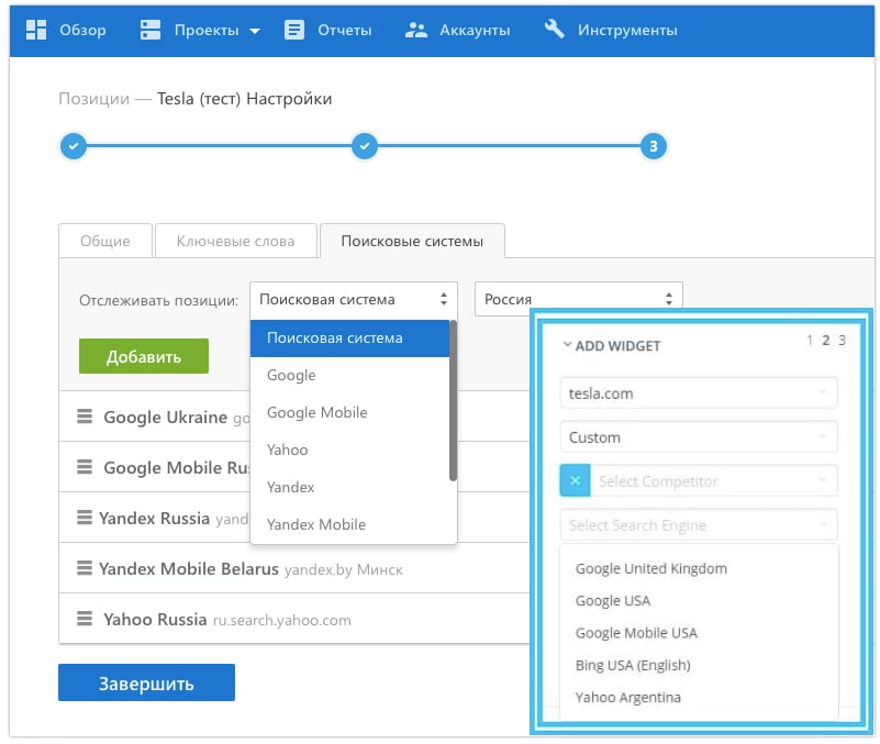 4. Im nächsten Schritt wählst du die Suchmaschine und den Standort aus. Du kannst nur die Suchmaschinen und Standorte auswählen, die bereits mit deiner Seite im SE Ranking verknüpft sind. Dasselbe gilt für die Rankings deiner Wettbewerber.
