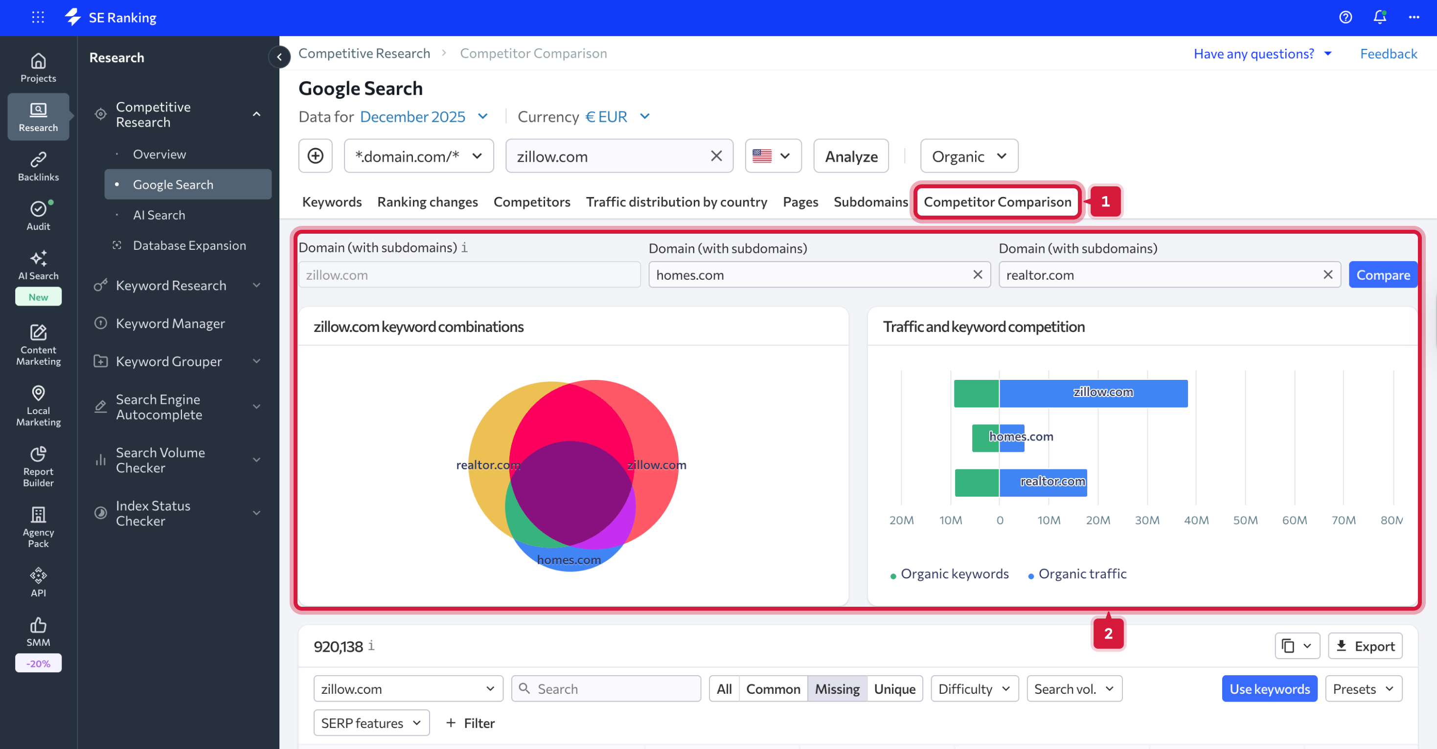 Das Tool erstellt eine umfassende Tabelle, die dir zeigt, wie viele Keywords die analysierten Domains gemeinsam haben. Du kannst jede der drei Domains miteinander vergleichen, z.B. Domain 1 gegen Domain 2, Domain 1 gegen Domain 3, Domain 2 gegen Domain 3. Du kannst überprüfen, welche einzigartigen Keywords jede Domain hat. Außerdem kannst du sehen, ob die analysierte Domain für einige Keywords nicht rankt, während ihre beiden Konkurrenten es tun.