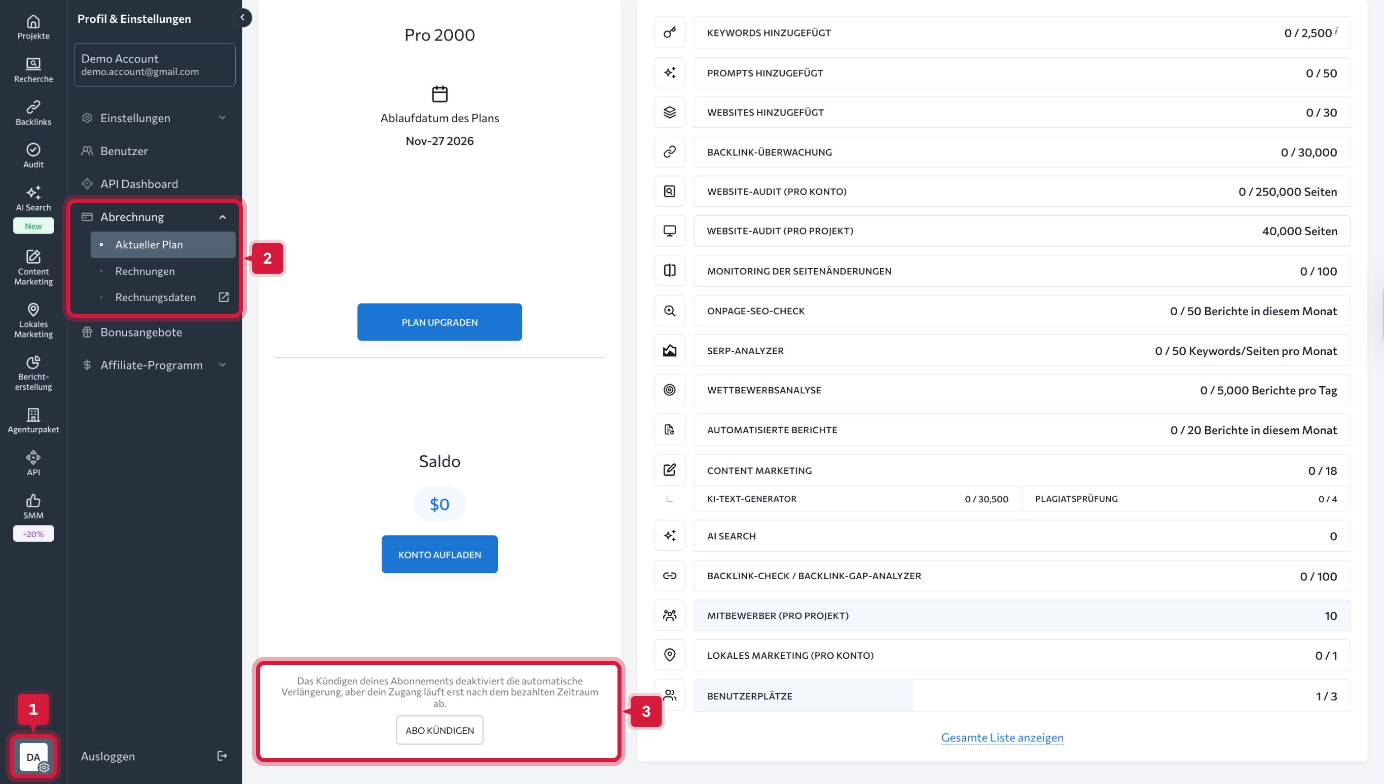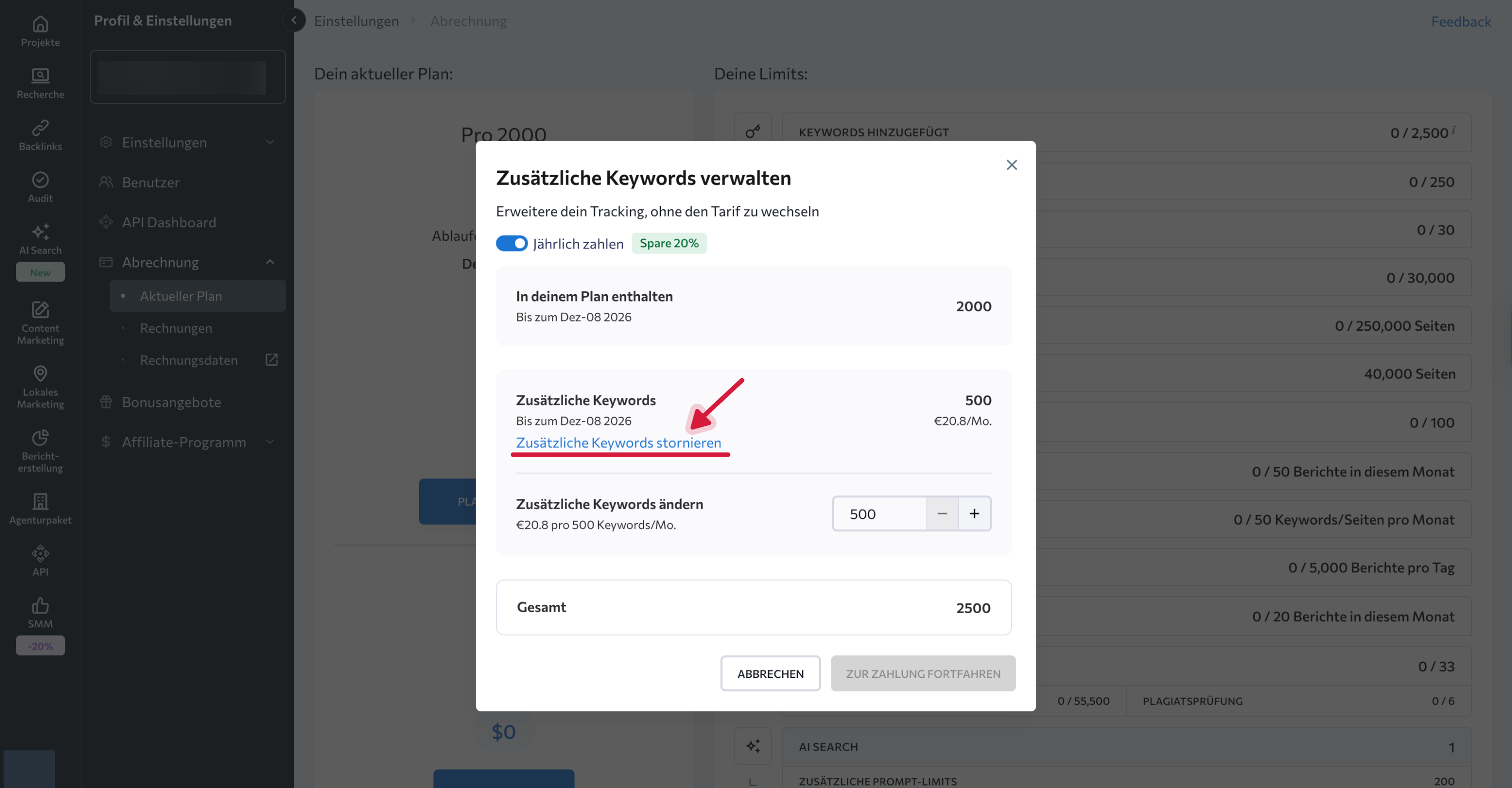Wenn du Add-ons separat gekauft hast (zum Beispiel zusätzliche Keywords, Content Marketing oder Local Marketing), muss jedes Add-on einzeln gekündigt werden.