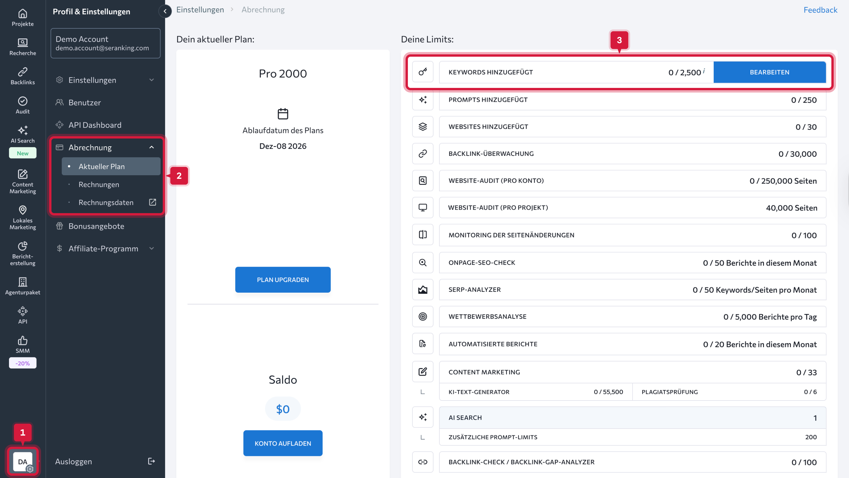 - Gehe zu Abrechnung > Aktueller Plan.