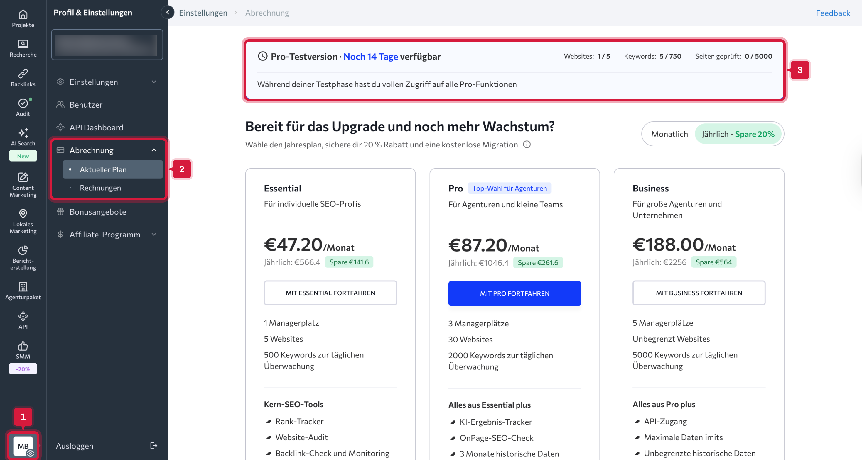 Die kostenlose Testphase von SE Ranking verlängert sich nicht automatisch zu einem kostenpflichtigen Abonnement, und es fallen keine Gebühren an, wenn sie endet.