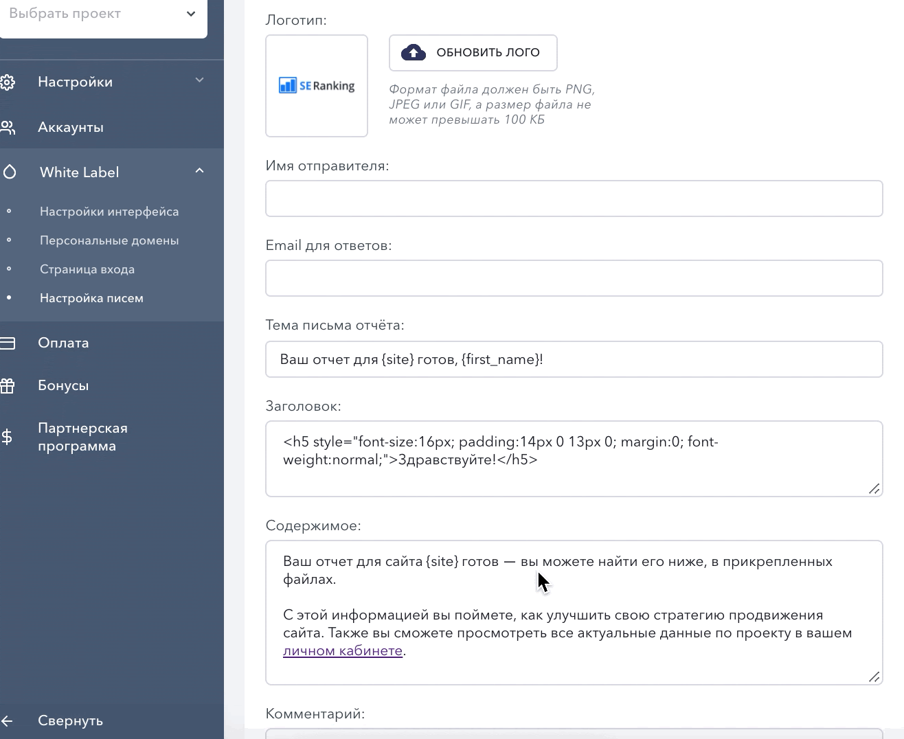 Upload a logo that will be displayed in emails, indicate the company name, the subject line, header and footer text. You can also customize the text, add links to it and get a preview of the email.