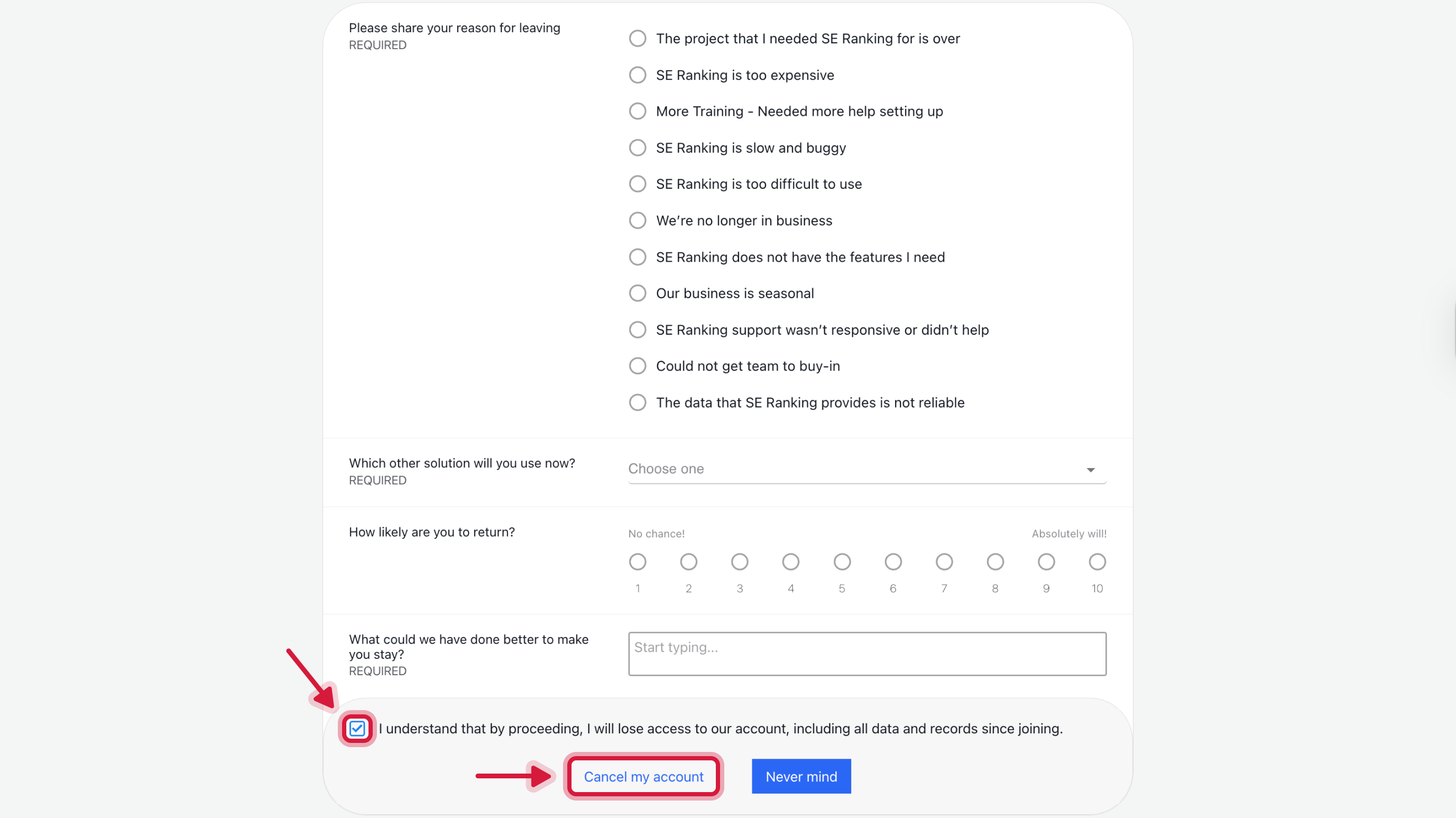 Important: On the confirmation screen, make sure you filled in the required fields and clicked the final confirmation button to complete the cancellation. If you select “Nevermind”, the process will be aborted and the subscription will remain active.