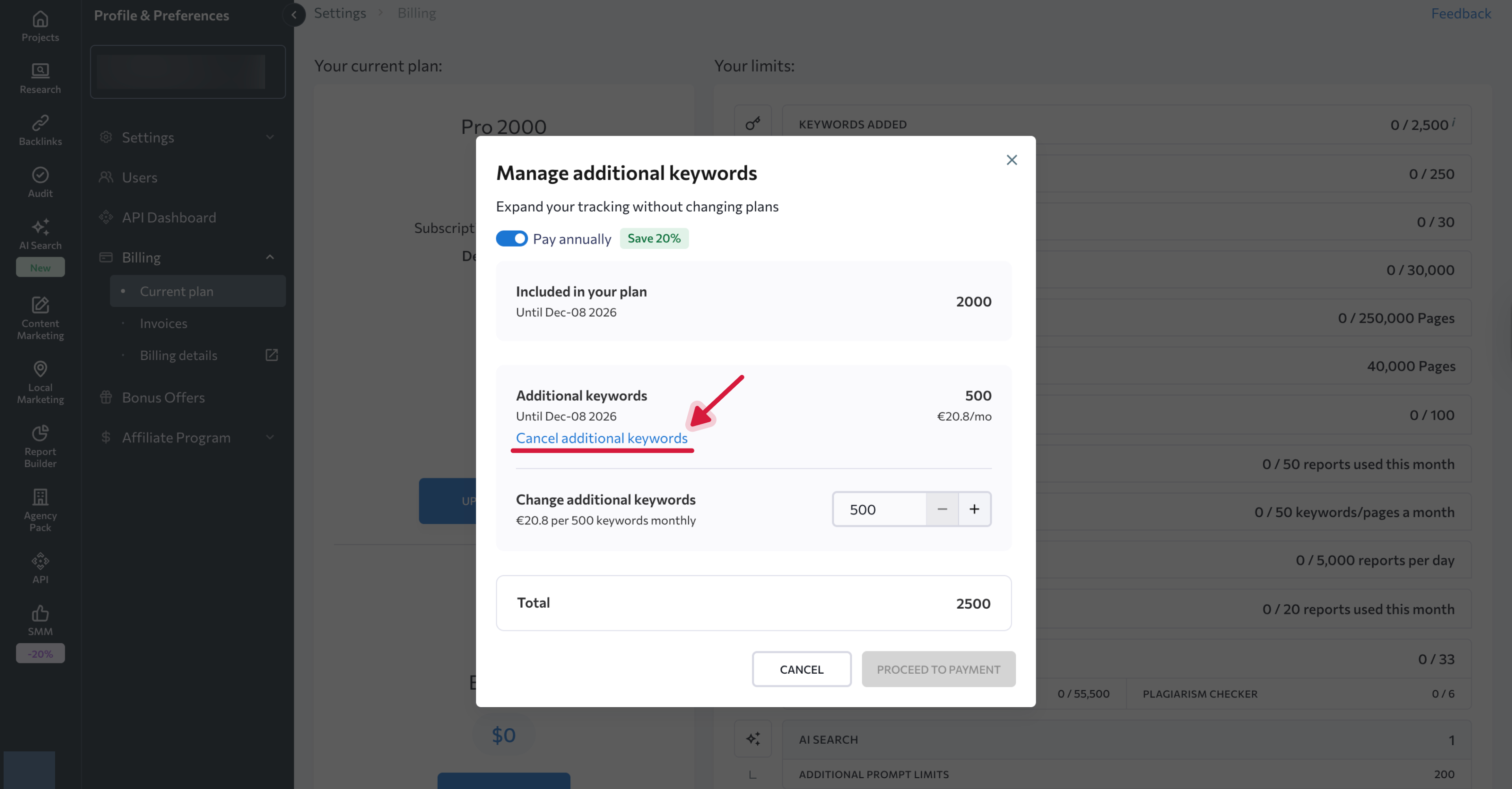 If you purchased any add-ons separately (for example, Additional Keywords, Content Marketing, or Local Marketing), each one must be cancelled individually.
