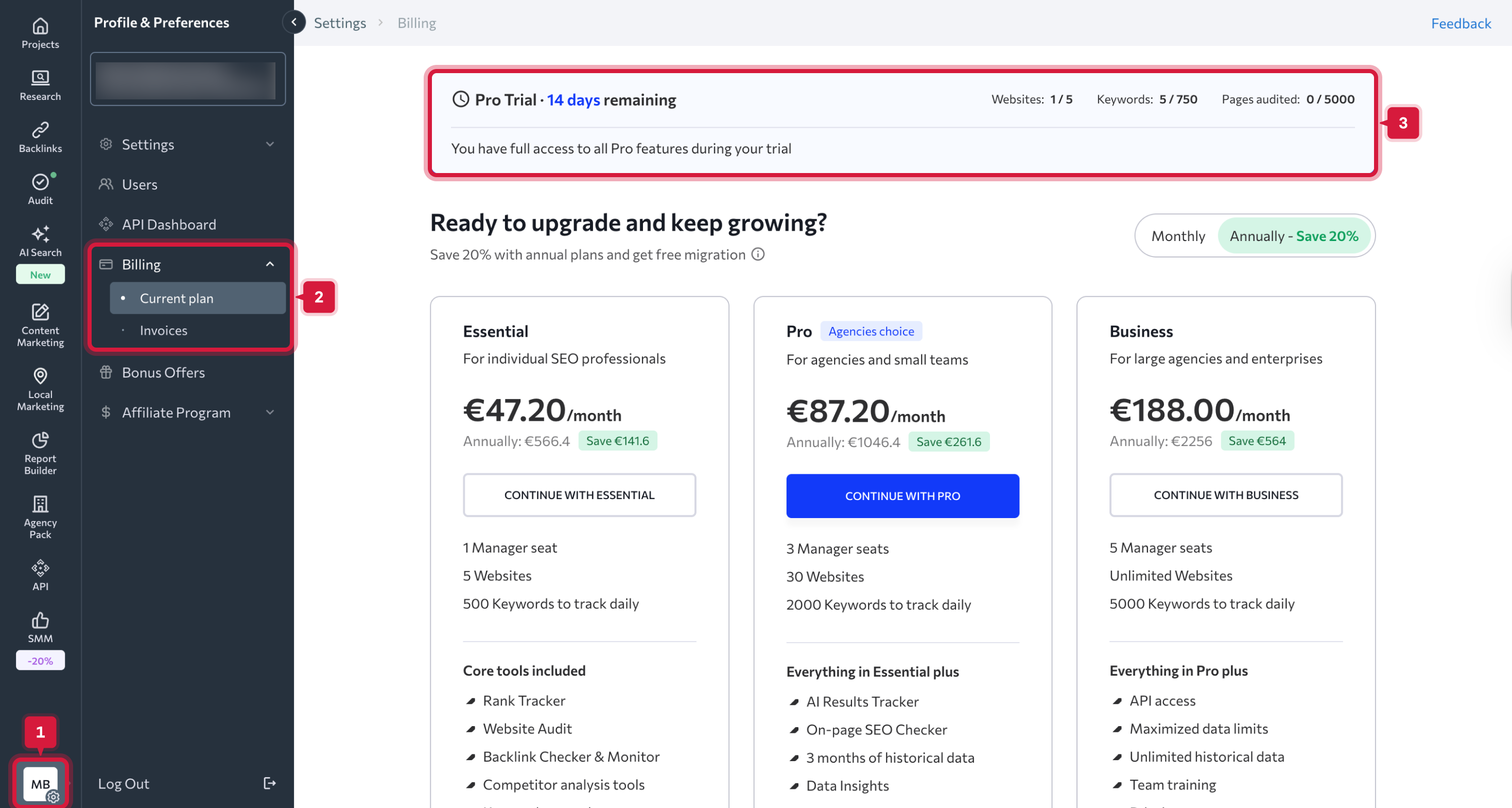 SE Ranking’s free trial does not renew into a paid subscription, and you will not be charged when it ends.