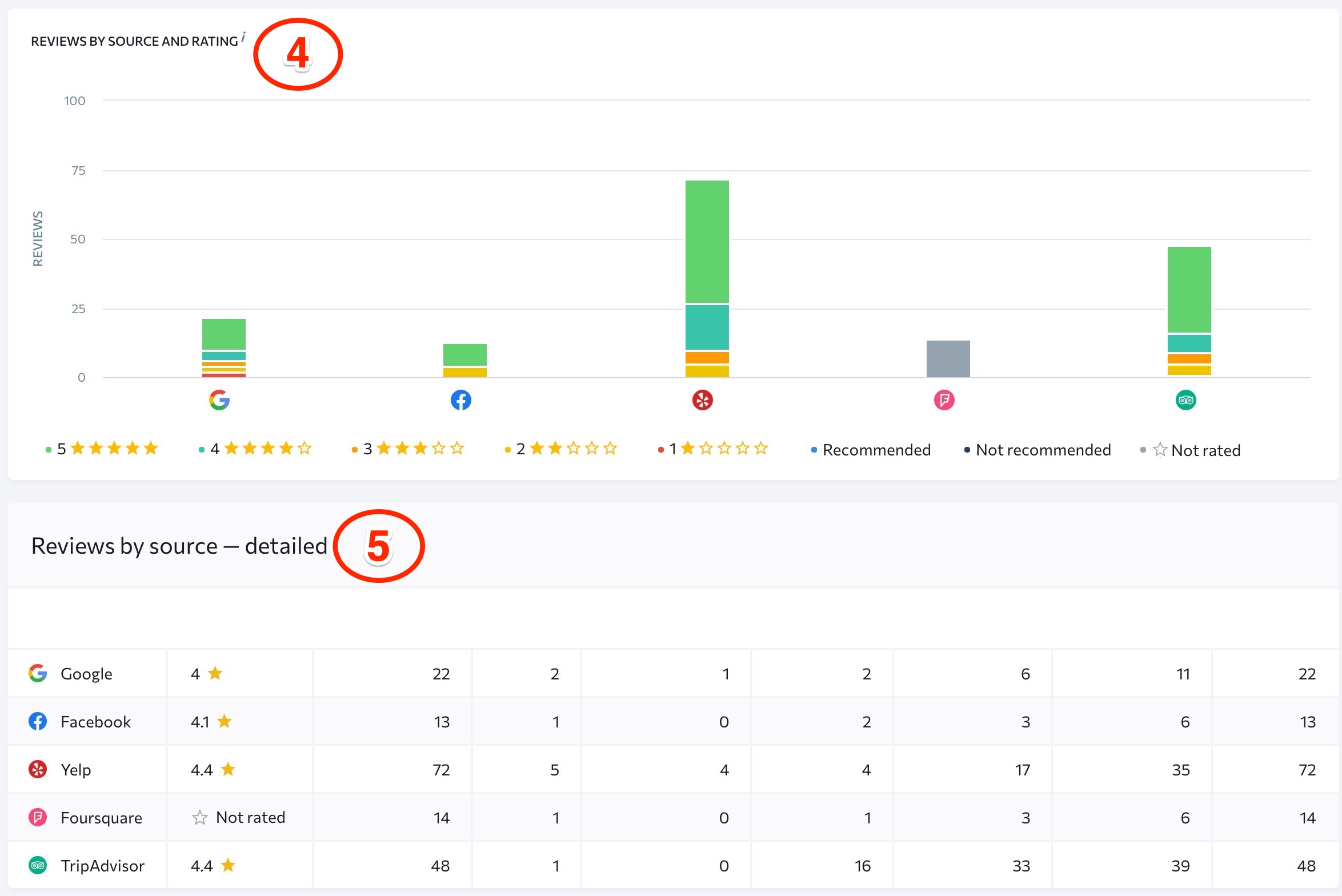 Reseñas por calificación. Este diagrama, aunque muestra la cantidad de reseñas con 5/4/3/2/1 estrellas, también muestra por separado la cantidad de reseñas de Facebook que tienen una calificación de "Recomendado" o "No recomendado". Además, muestra la cantidad de reseñas de Foursquare (si las hay) que no están calificadas, ya que no hay calificación en esta fuente de reseñas.