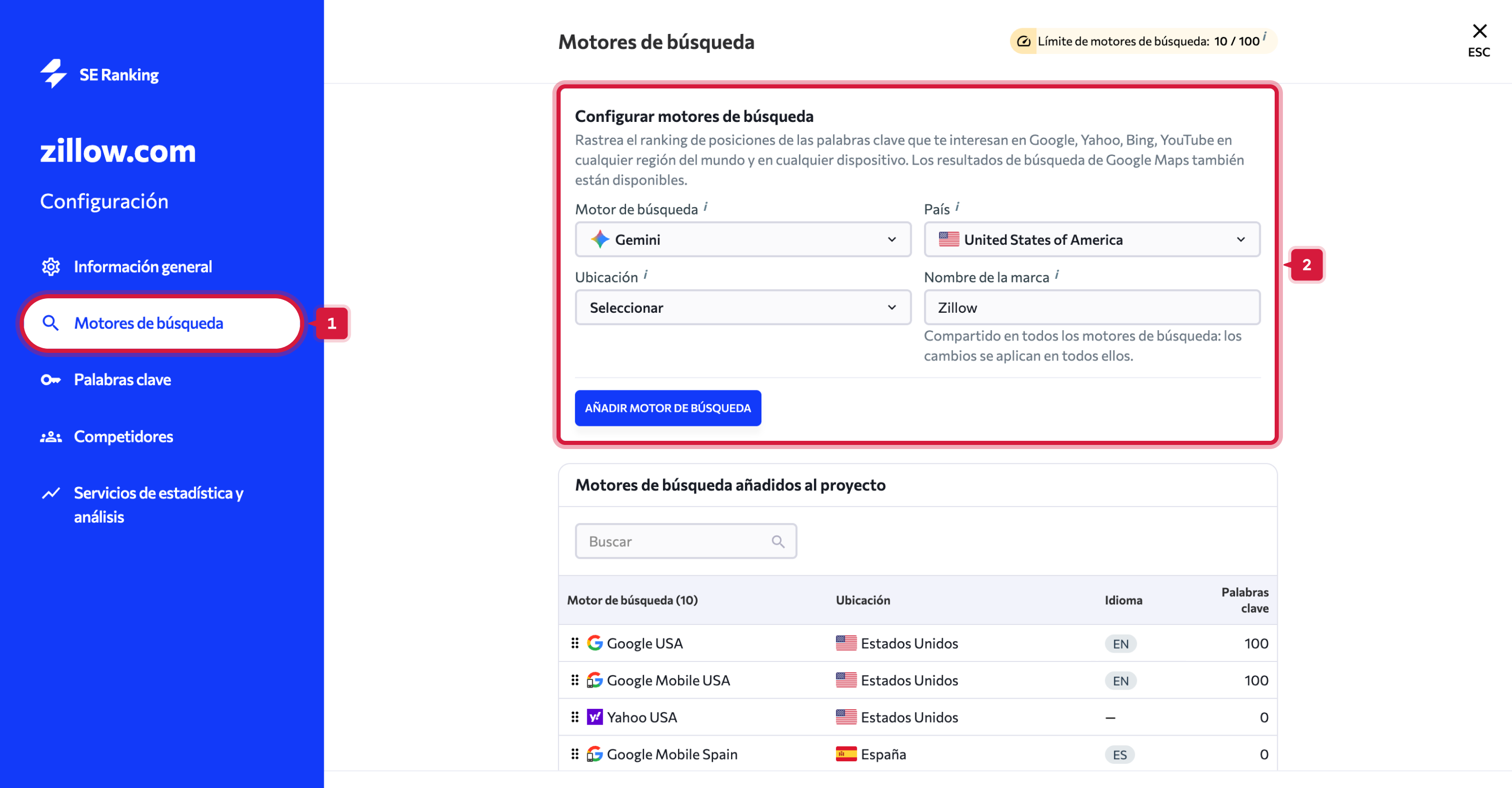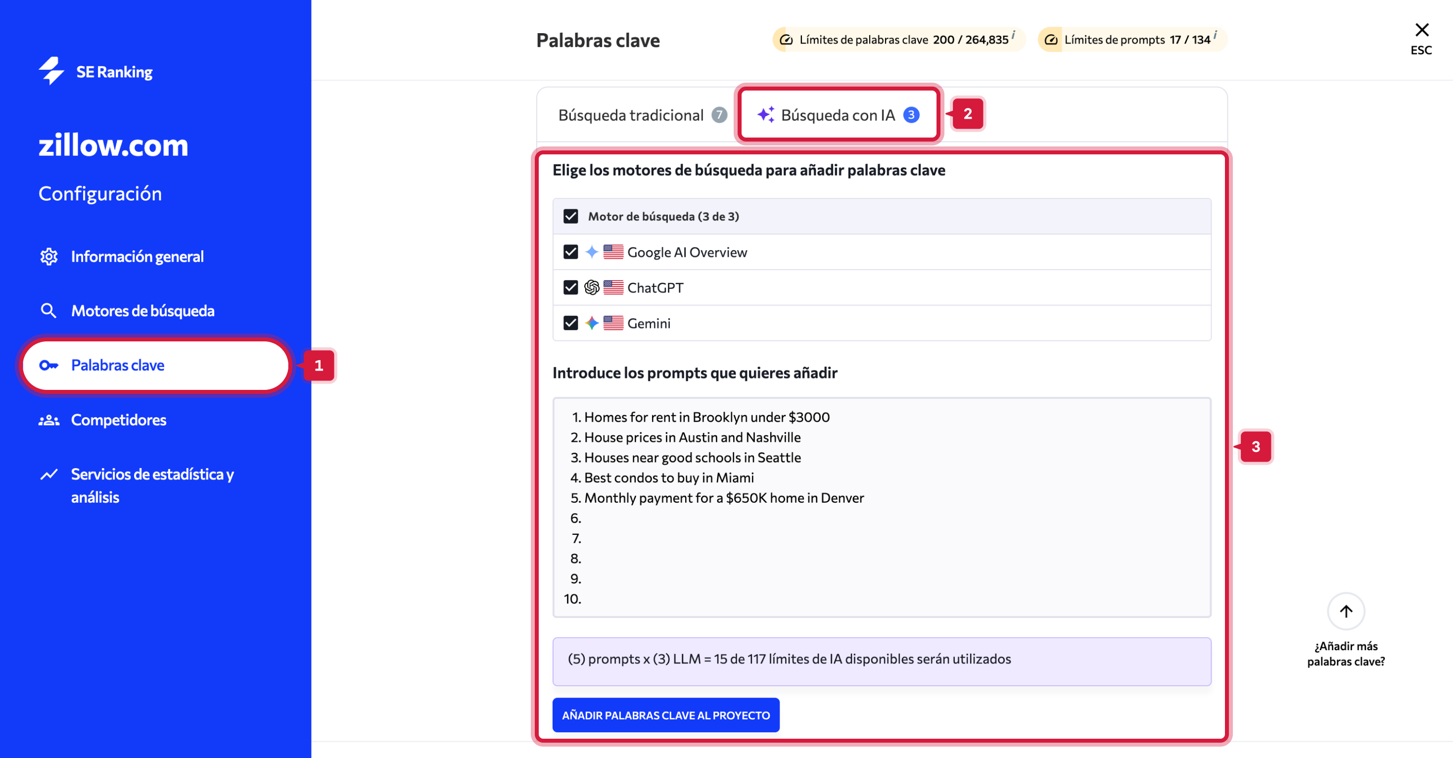 - Haz clic en “+ Añadir prompts” o ve a Configuración del proyecto > Motores de búsqueda.