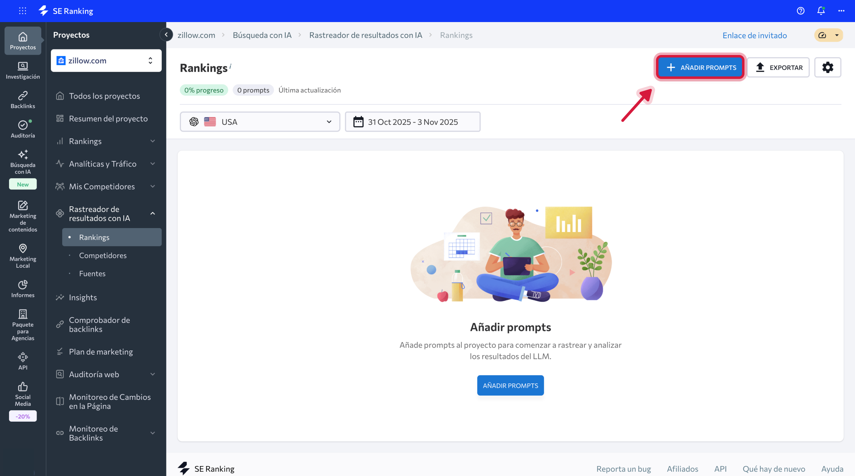 Si acabas de abrir el Rastreador de resultados con IA y aún no ves datos, primero debes añadir motores de búsqueda con IA y prompts a tu proyecto. Estos determinan qué consultas (prompts) rastreará SE Ranking y en qué plataformas de IA.