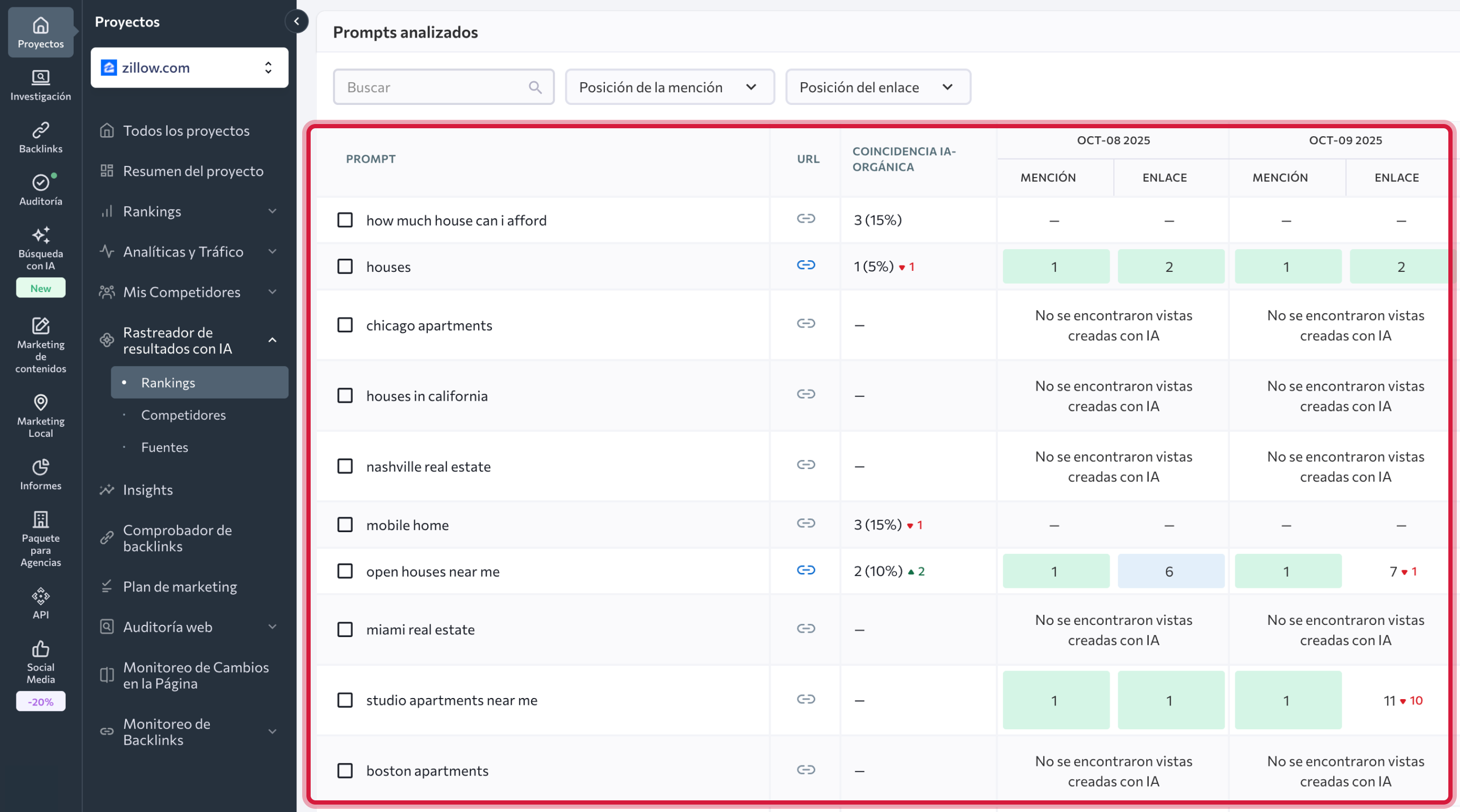 | Enlace | Muestra si tu página fue enlazada en la respuesta de IA y en qué posición. |