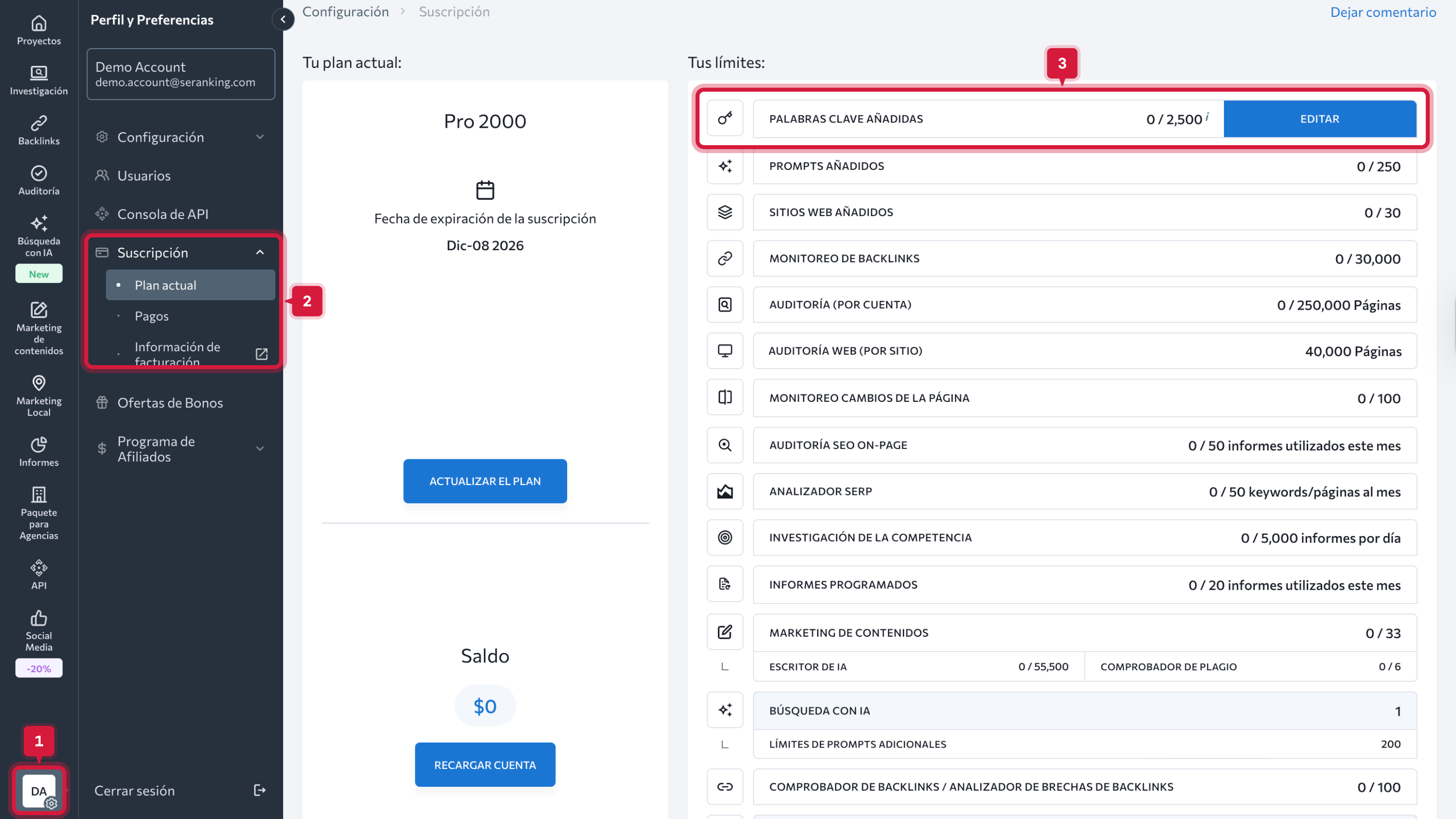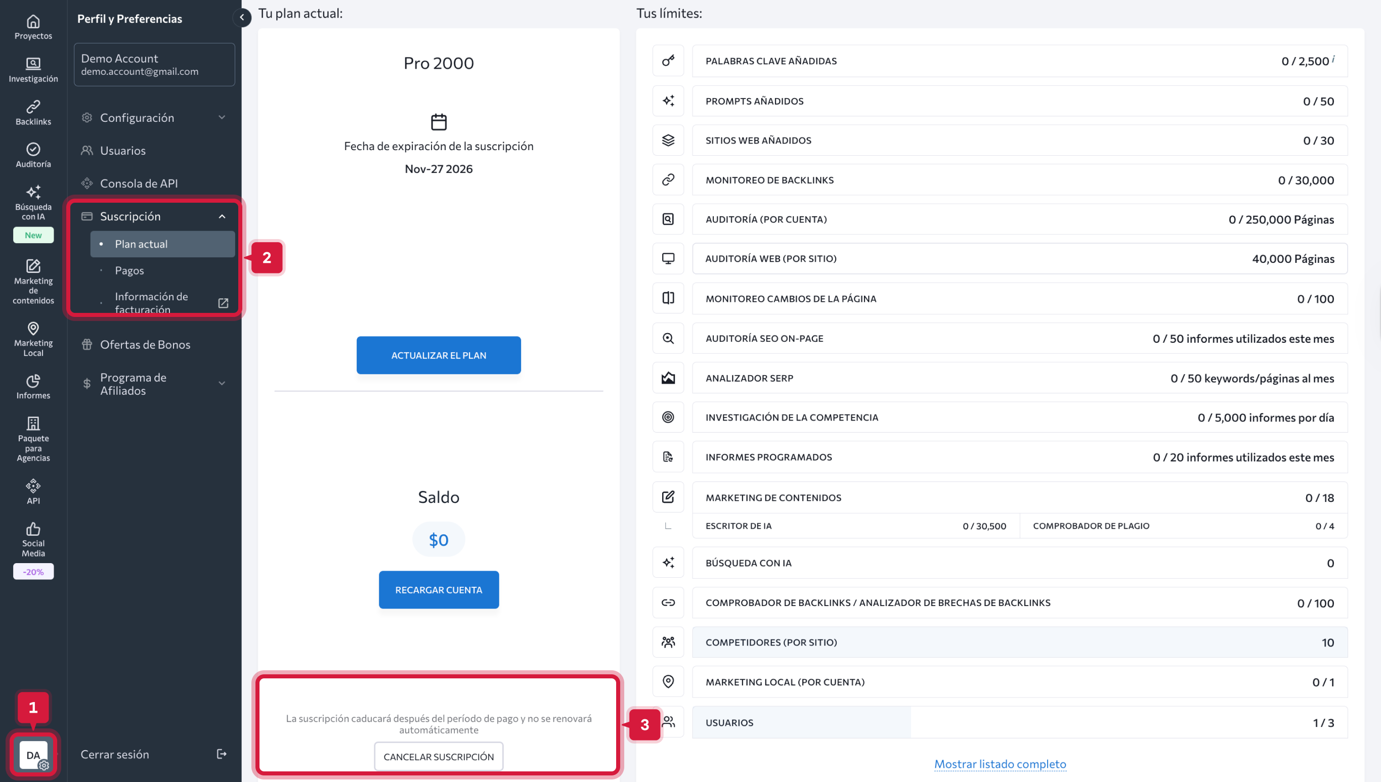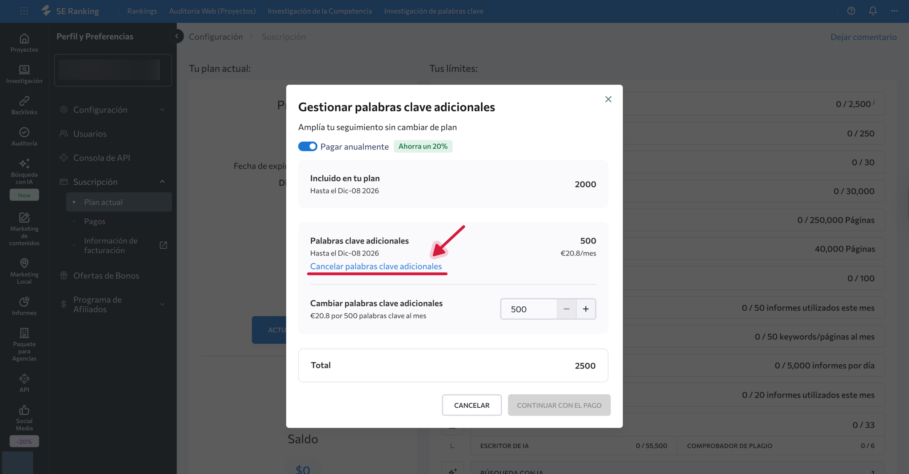 Si compraste complementos por separado (por ejemplo, Palabras clave adicionales, Marketing de contenidos o SEO local), cada uno debe ser cancelado individualmente.