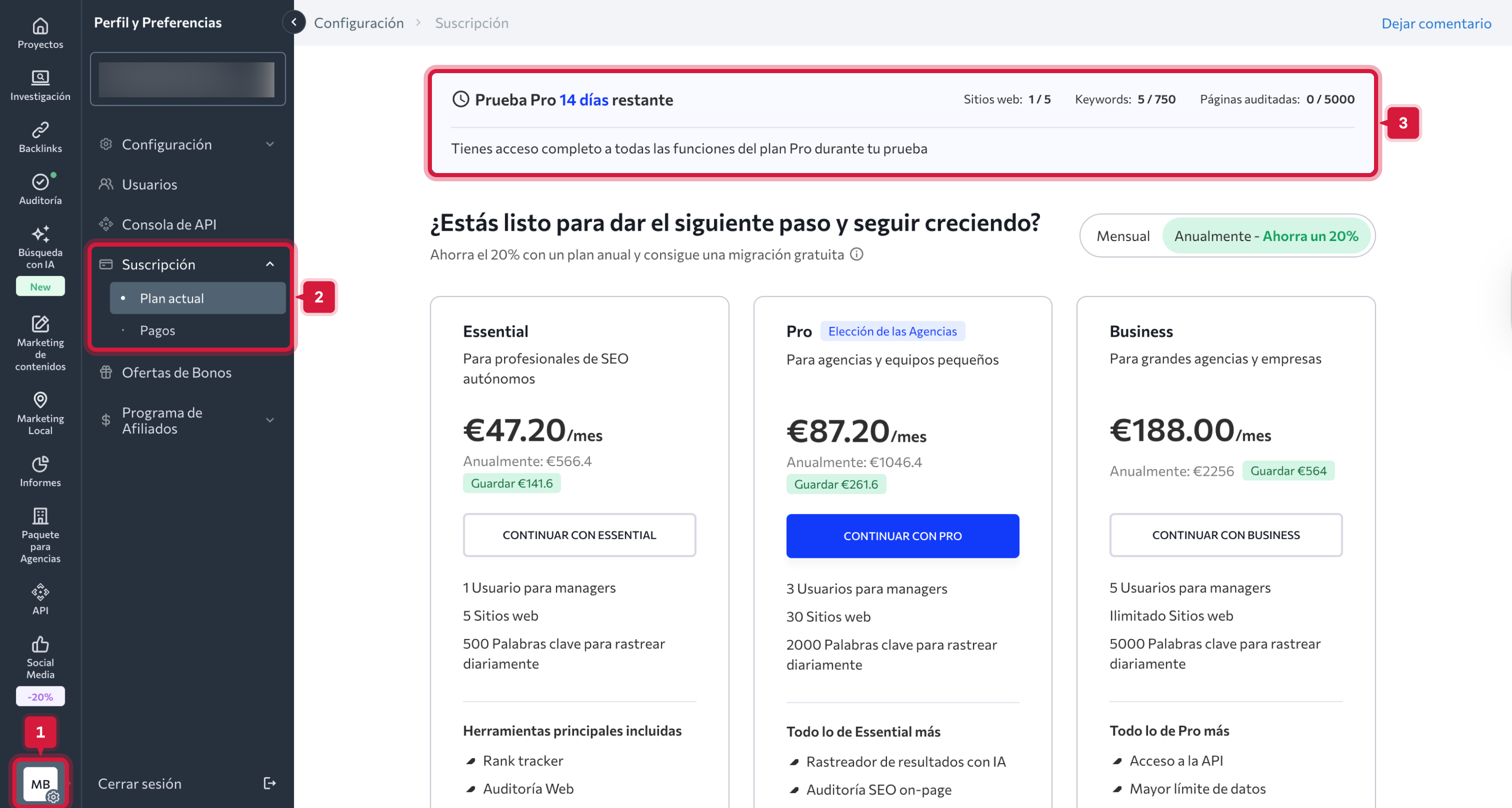 A Sí. Puedes suscribirte a cualquiera de los planes disponibles en cualquier momento y seguir utilizando SE Ranking cuando estés listo.