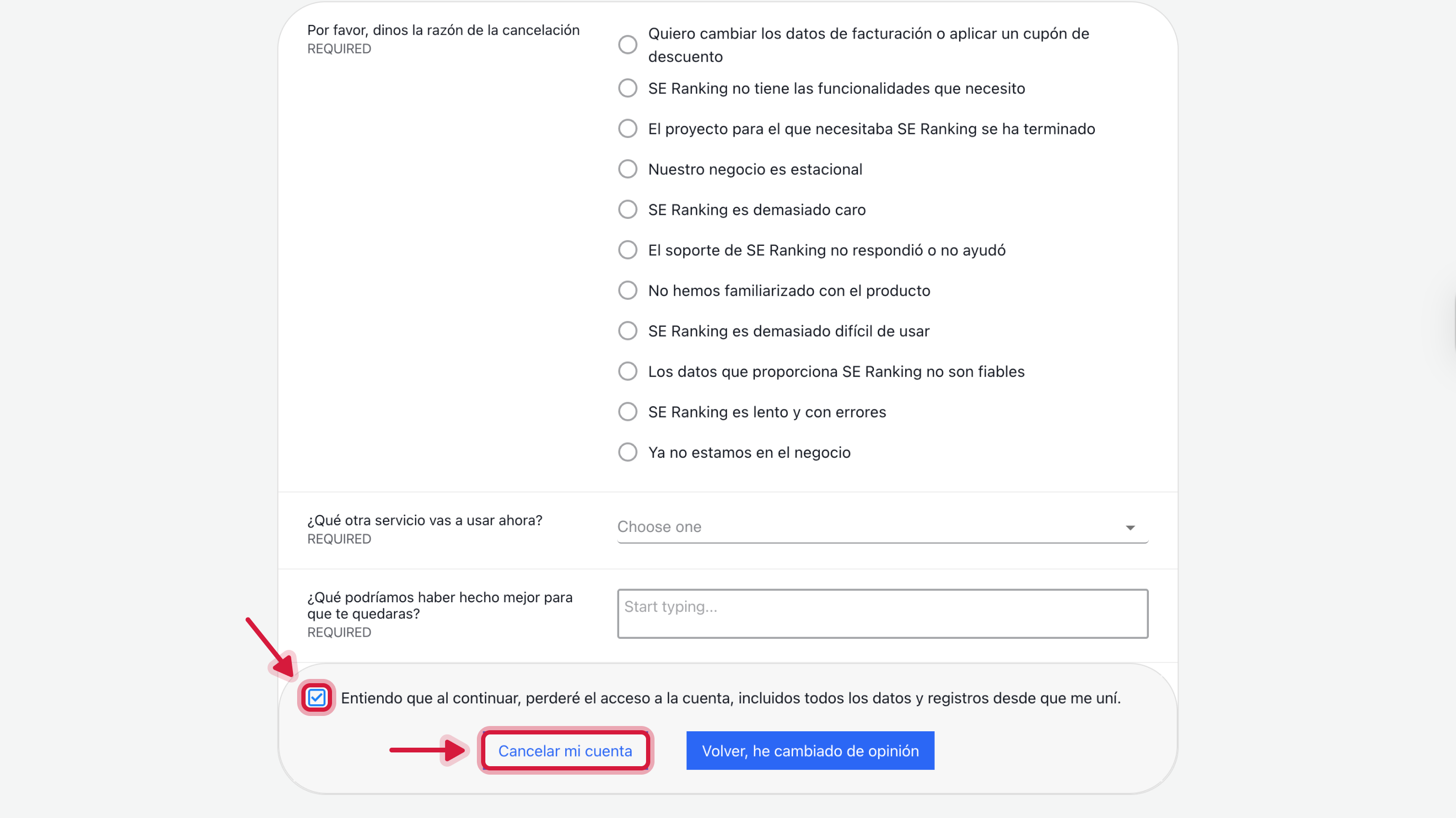 Eliminar tu cuenta de SE Ranking