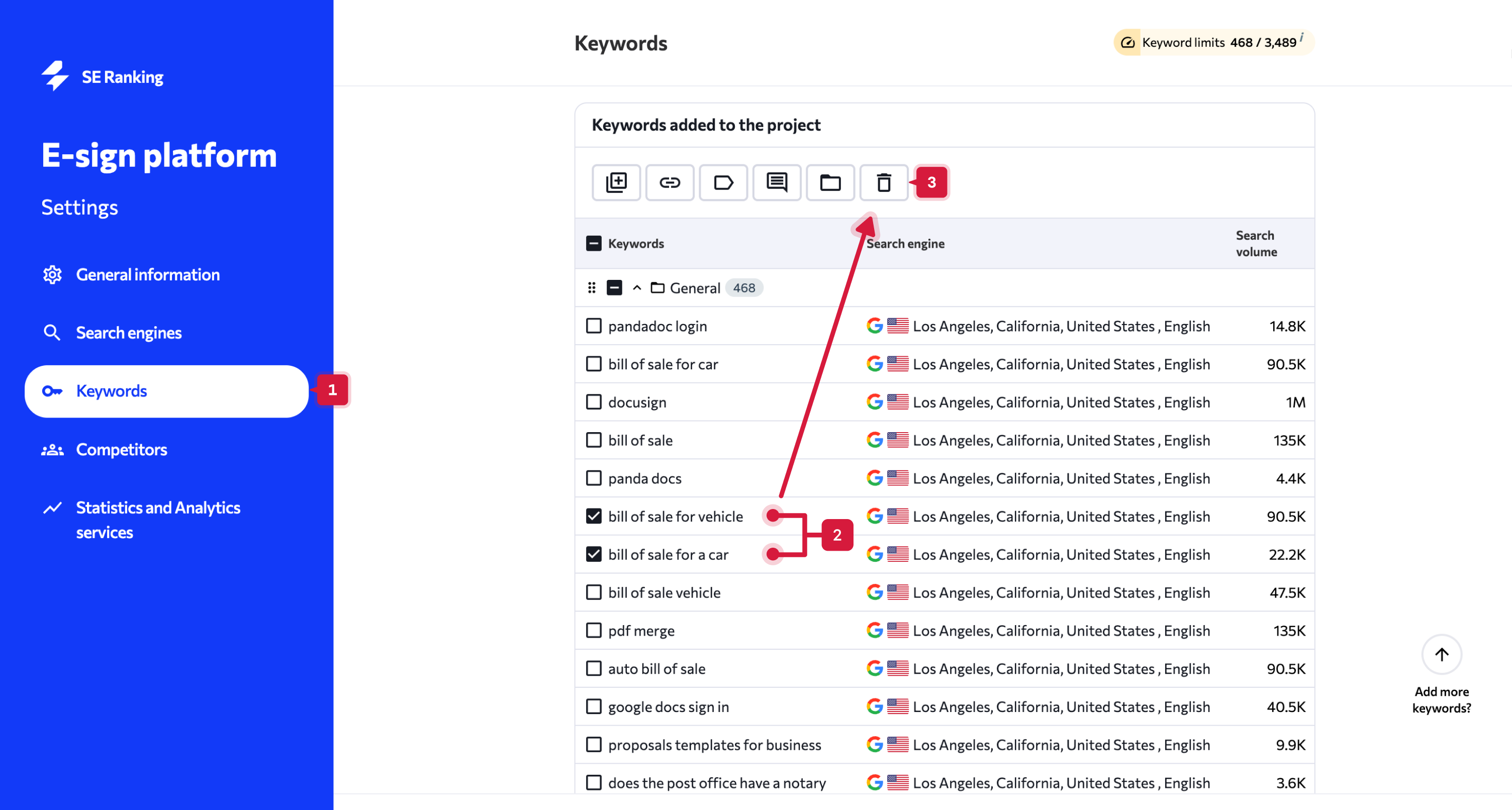 - Sélectionnez les mots-clés que vous souhaitez supprimer.