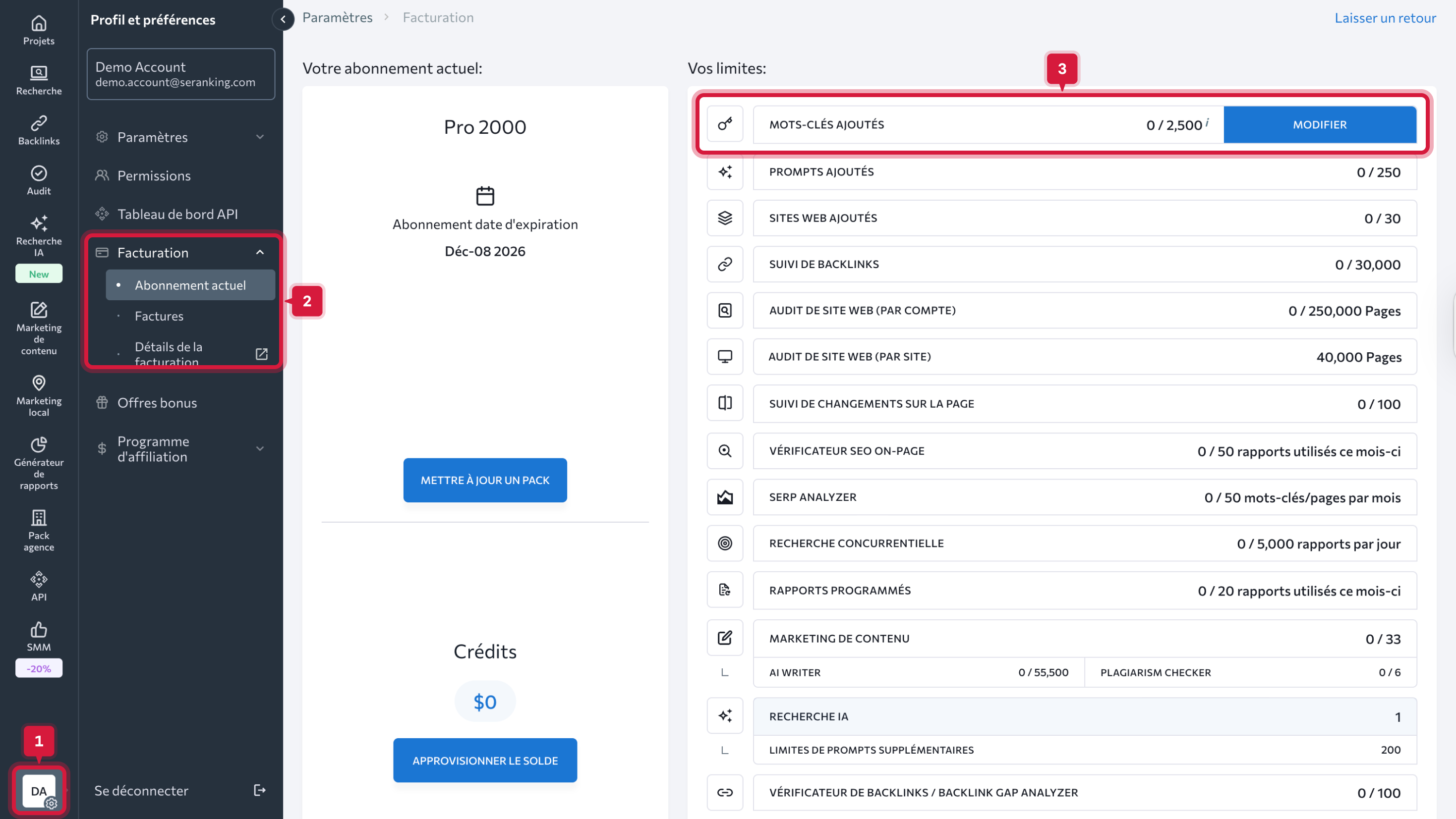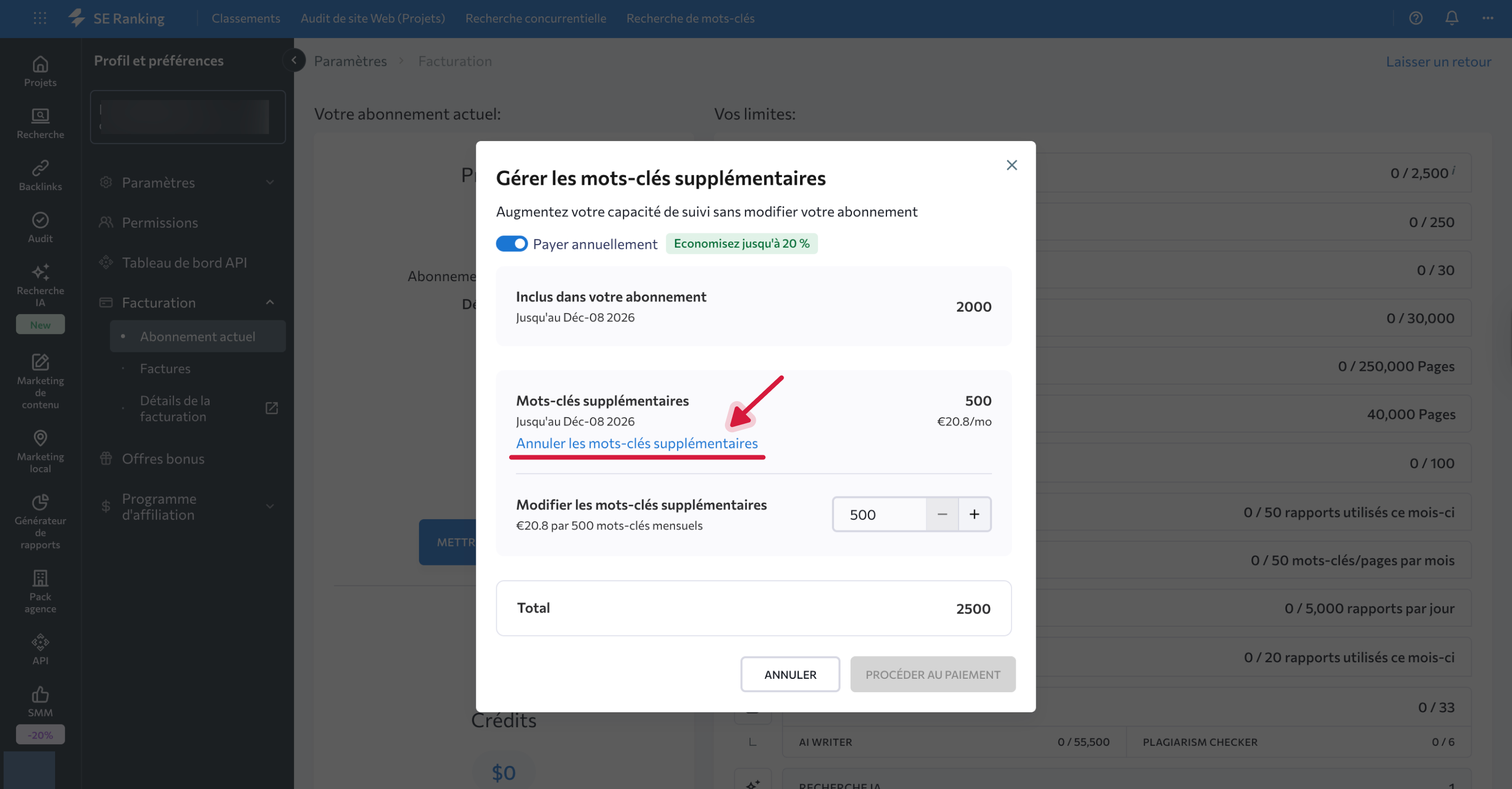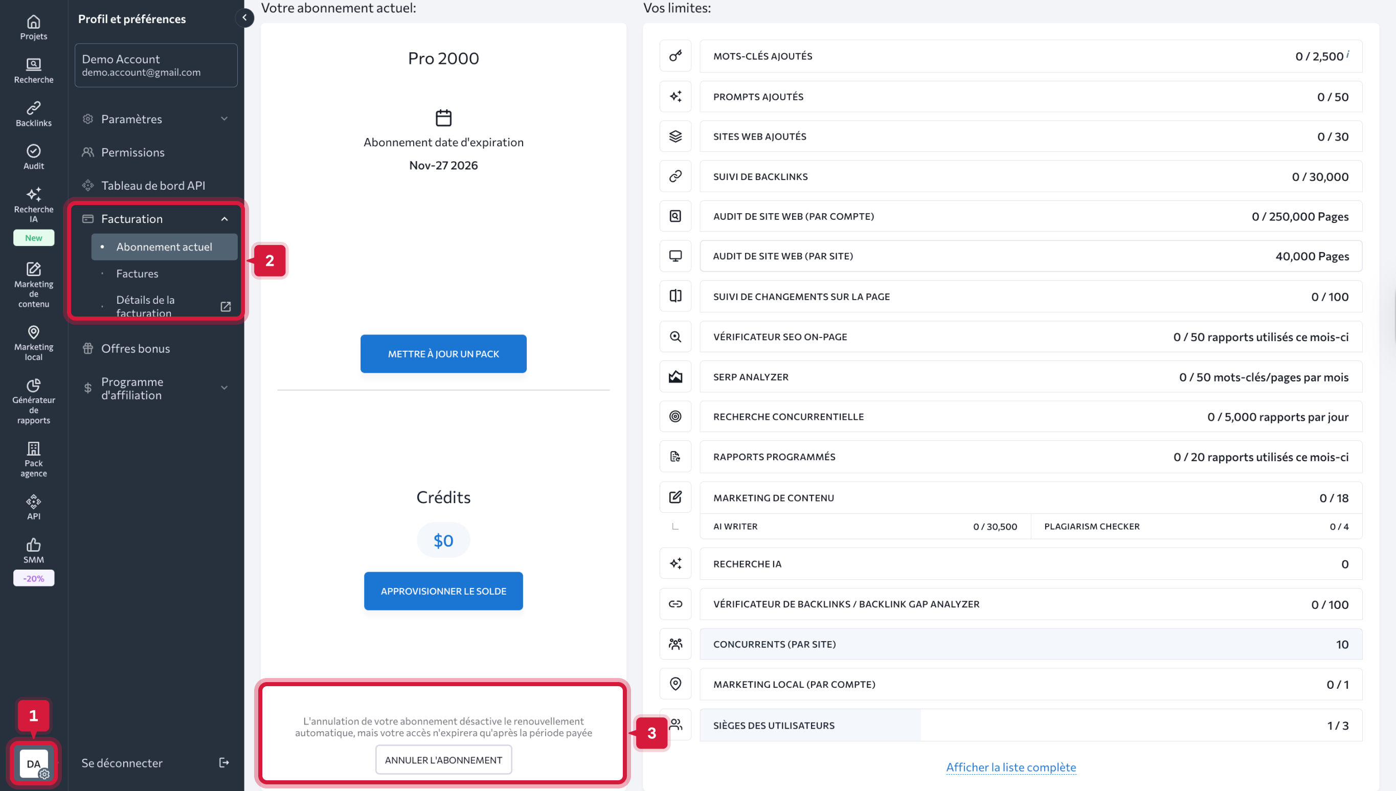 Les modules achetés séparément, comme Mots-clés supplémentaires, Marketing de contenu ou Marketing local, nécessitent une résiliation individuelle.