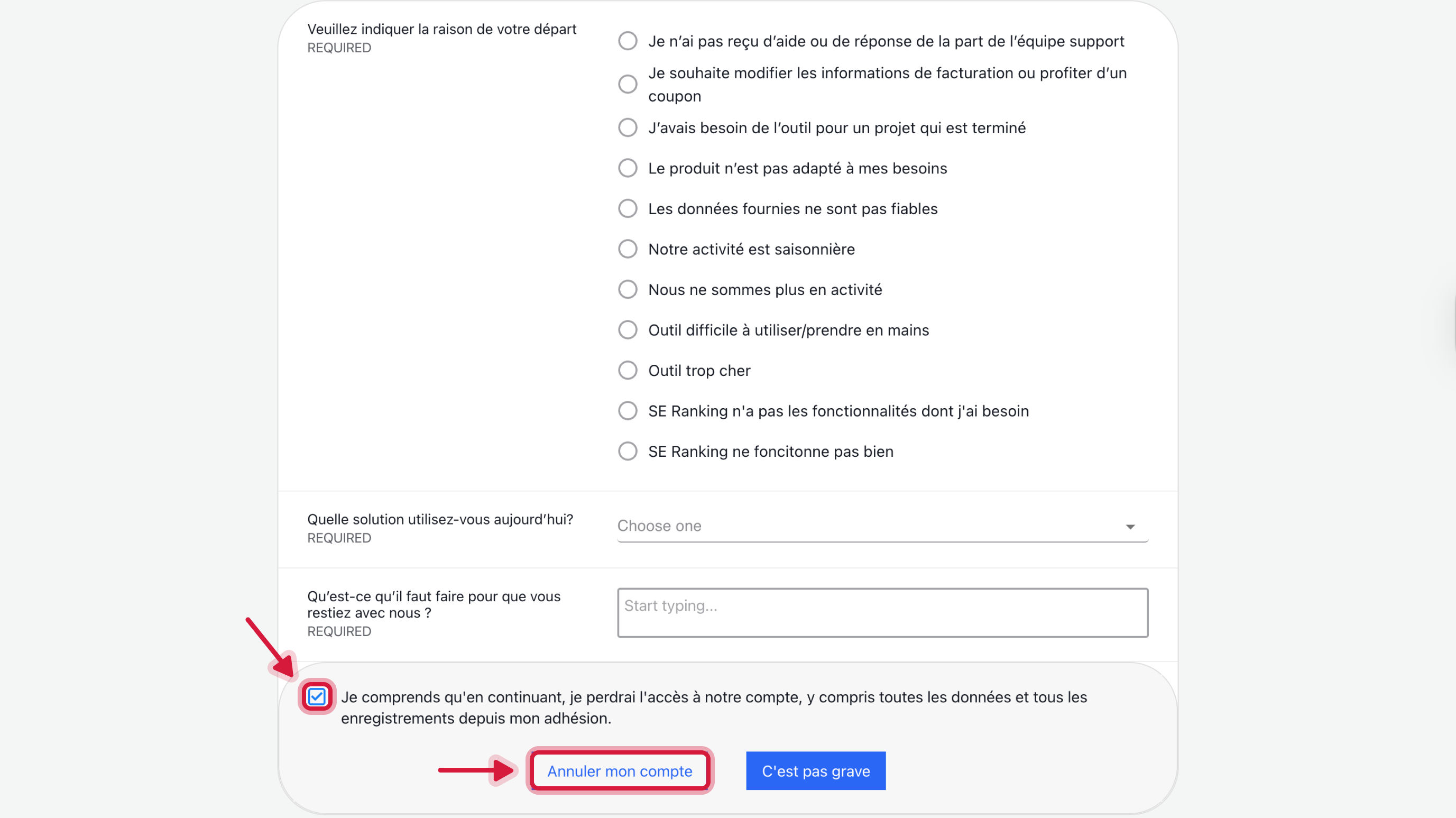 Supprimer votre compte SE Ranking