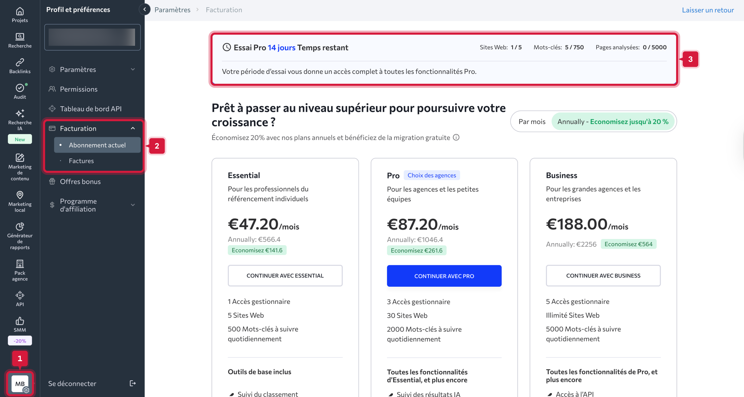 L’essai gratuit SE Ranking arrive à son terme sans conversion automatique en abonnement payant et aucune facturation n’a lieu à son expiration.