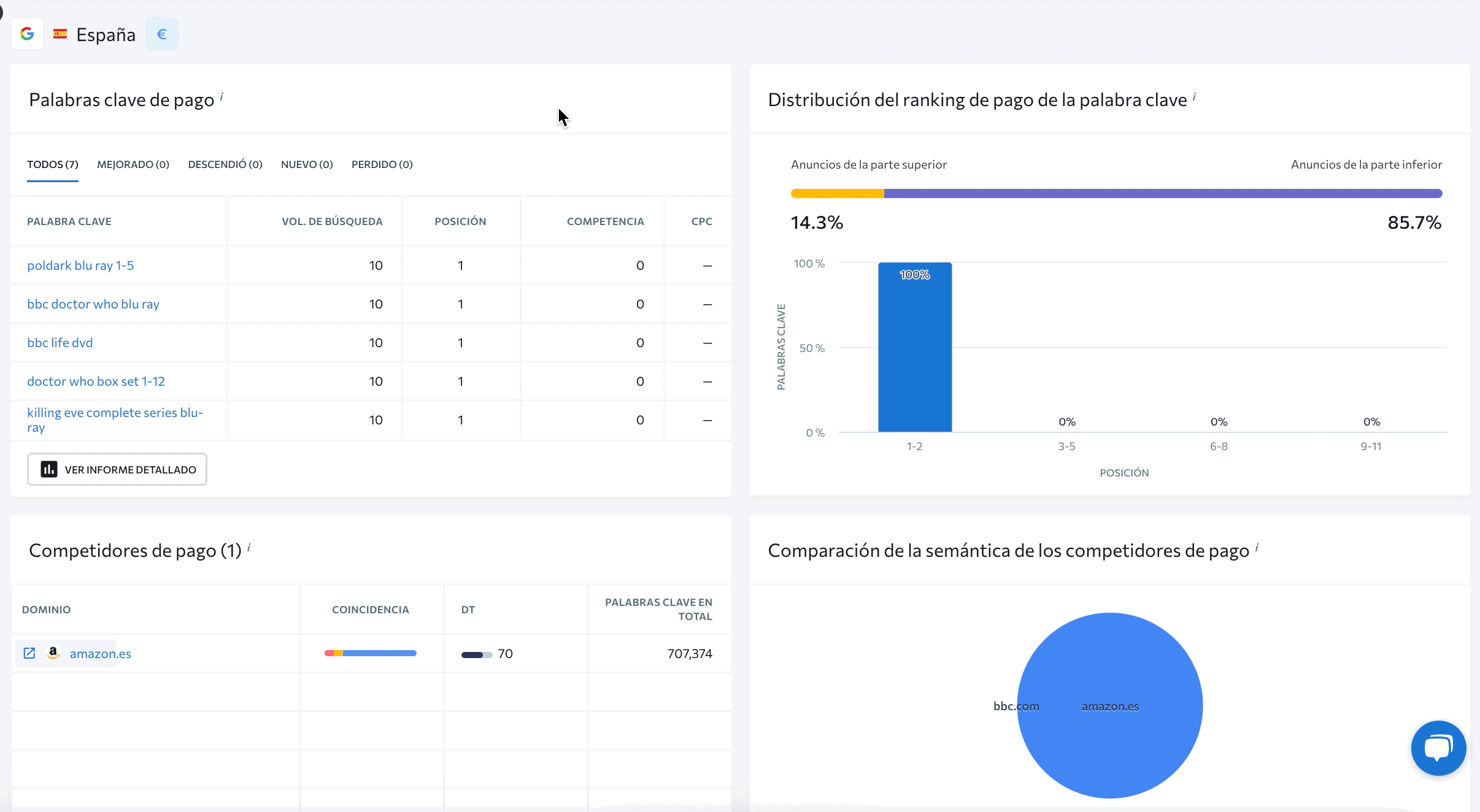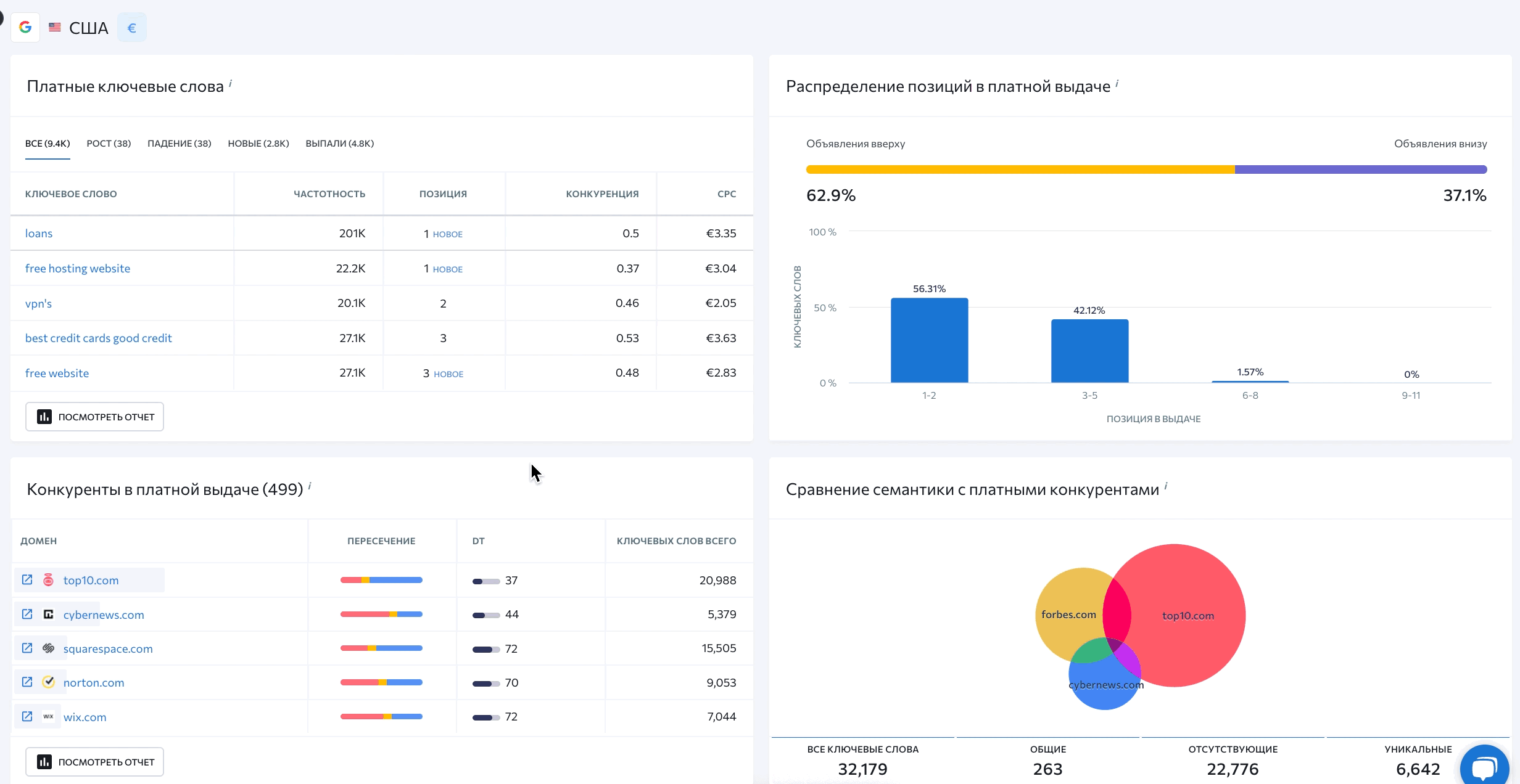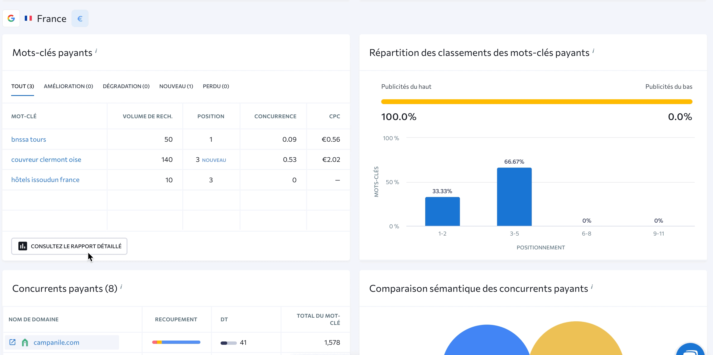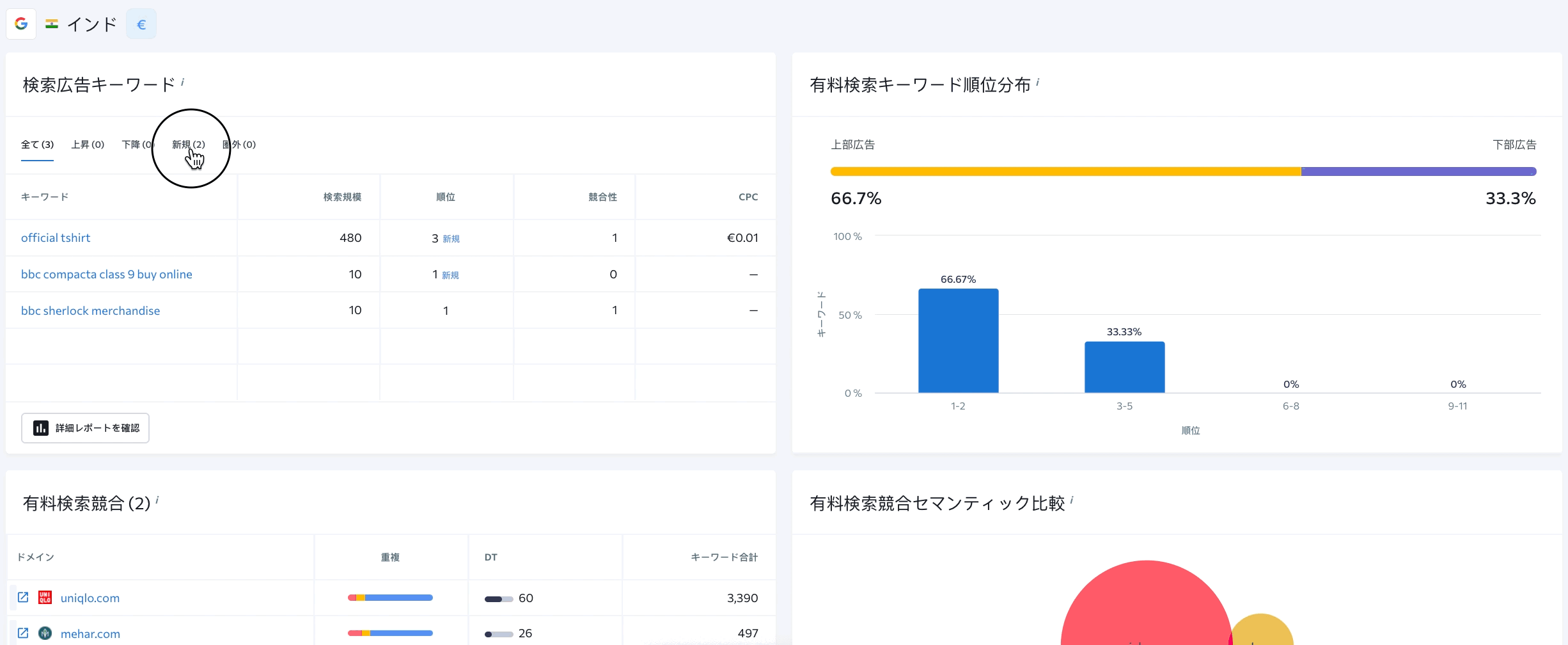 オーガニック指標の概要セクションの下には、 有料検索に関するキーワード、競合、 比較、分布などの情報が表示されます。