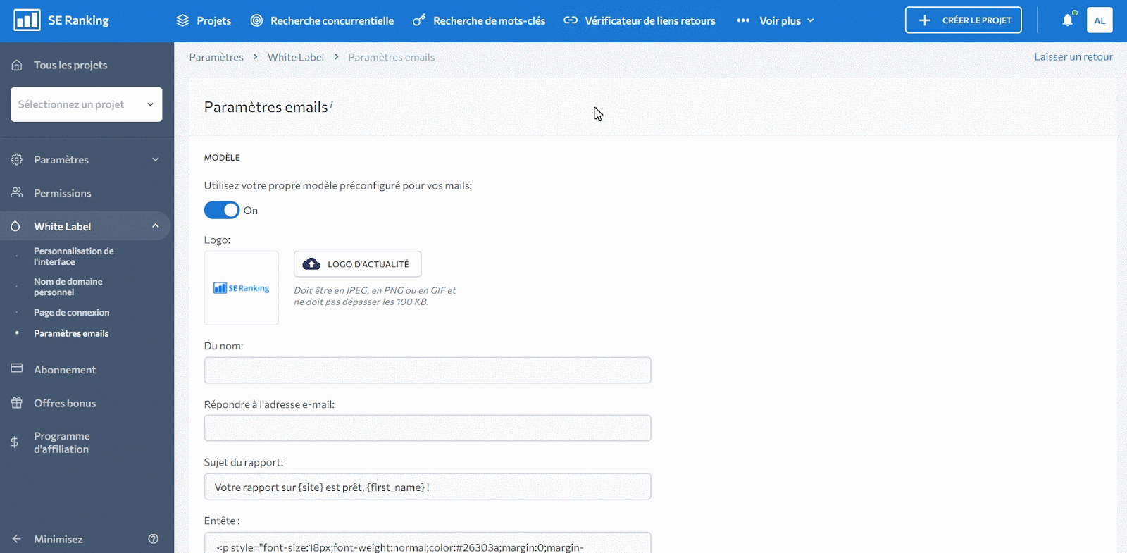 ホワイトレーベル機能では、レポート送信用に自身のSMTPサーバーを設定する事ができます。定期、手動レポートやシステム通知はあなたのEメールアドレスから送信されるようになります。(例: seo-reports@agency.com) 全て設定を行った後、適切に動作するかを確認する為、あなたのEメールアドレスにテストメールを送信しましょう