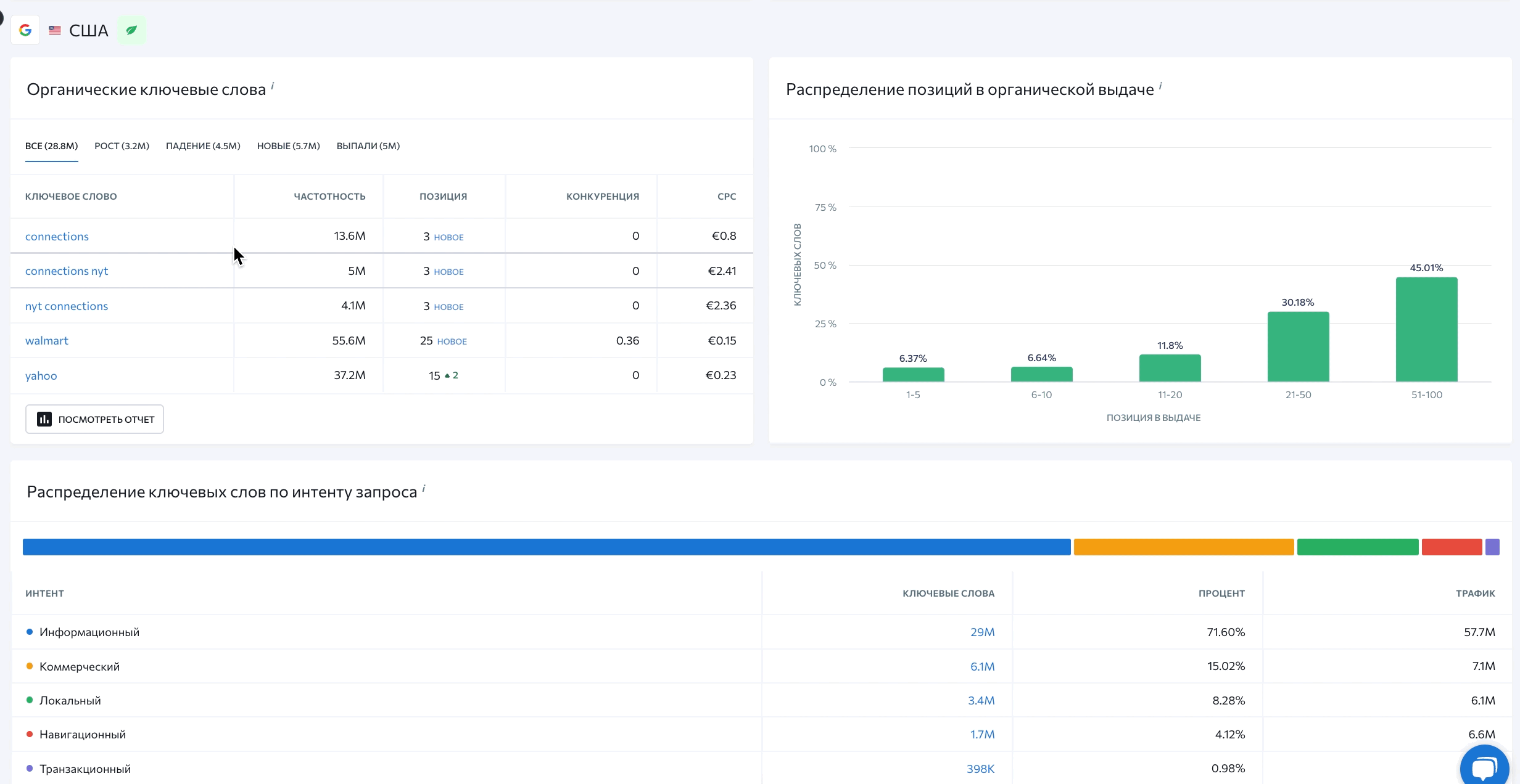 Ниже на странице представлены сводные графики и таблицы, предназначенные для анализа органического трафика сайта.