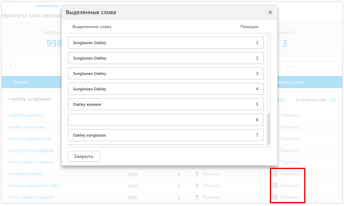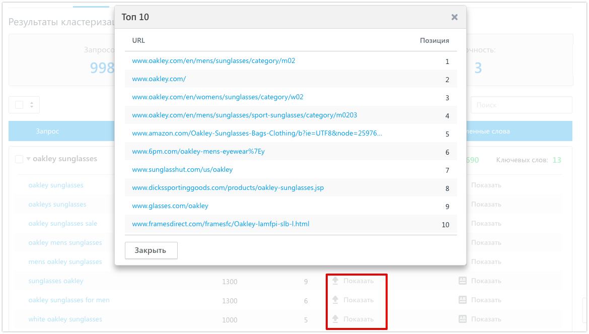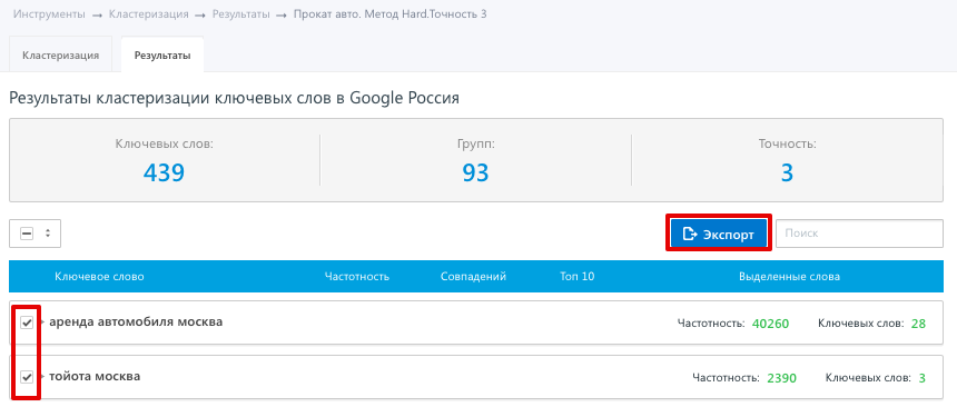 Во вкладке «Кластеризация» –> «Результаты» хранится 100 последних результатов кластеризации. Чтобы просмотреть результаты, нажмите стрелочку.