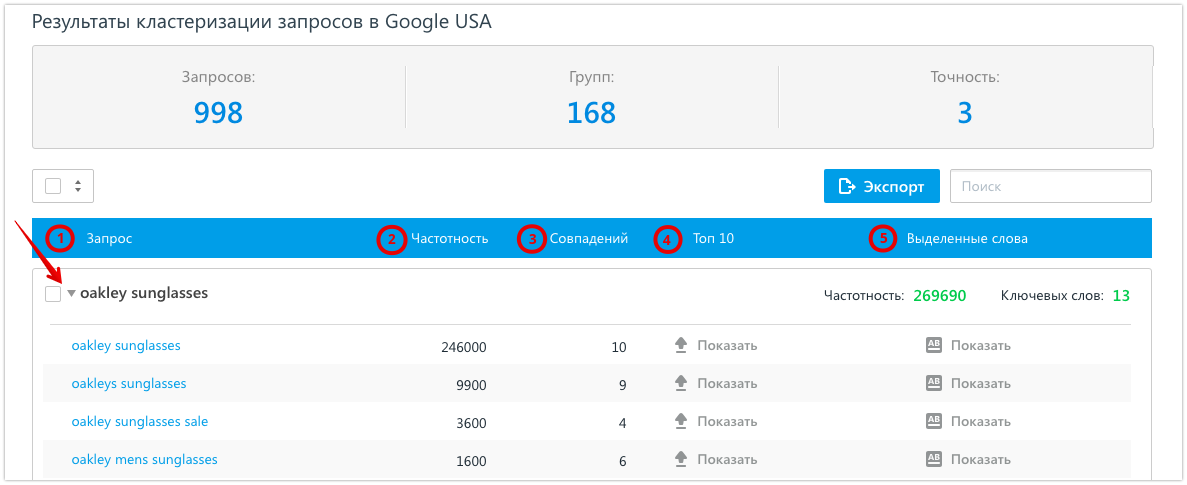 2. Частотности запросов (доступны только при активной функции проверки частотности). 3. Количество совпадений URL, обнаруженных сервисом при сканировании поисковой системы (с учетом выставленного минимального порога совпадений).